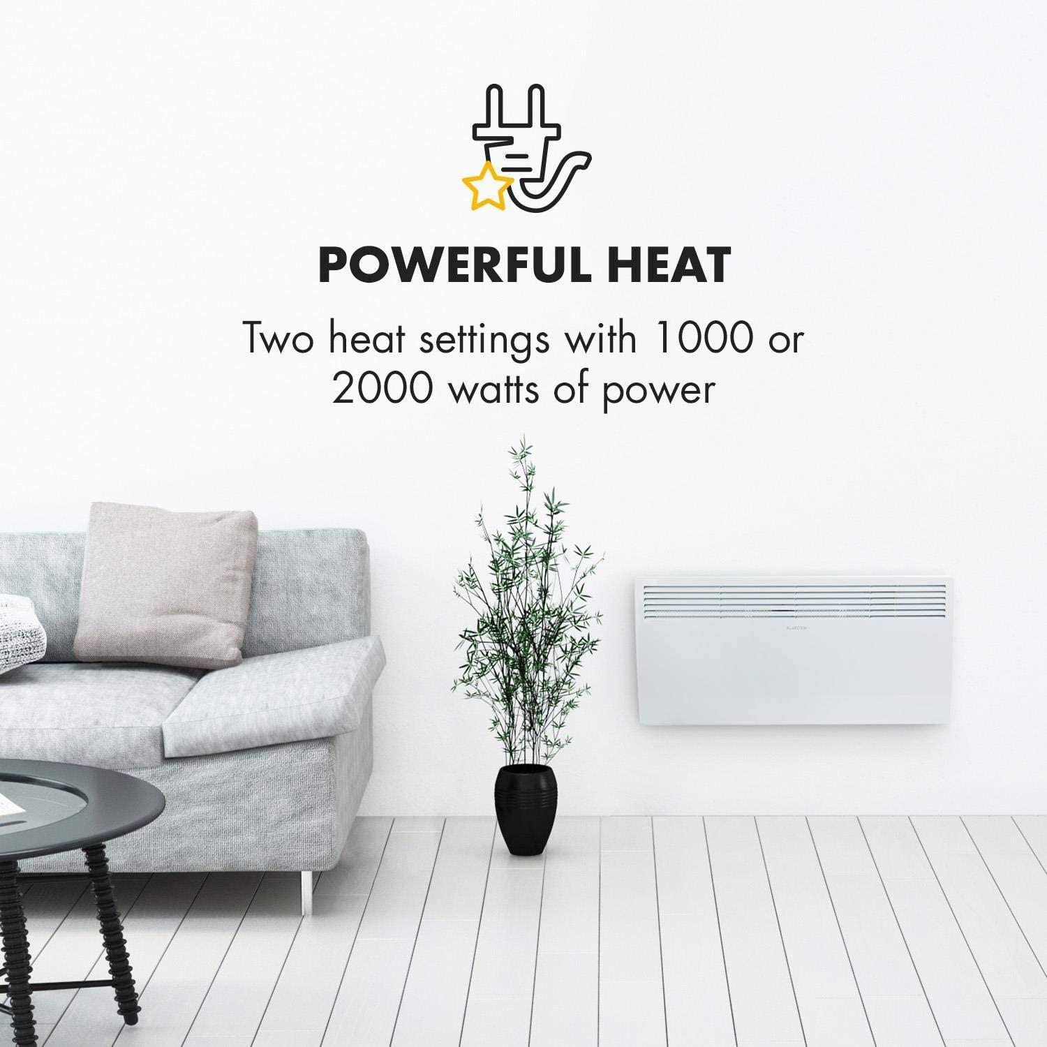 - POWERFUL: The Klarstein Hot Spot wall mountable heater revolutionizes heating in record time, it heats and circulates warmth through the air using convection heat with up to 1400 Watts of power.