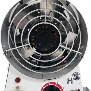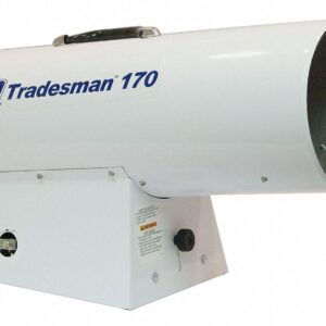 Portable Gas Torpedo Heater, Fuel Type Natural Gas, Heating Capacity Output 155,000 BtuH, Heating Area 3,500 sq ft, Minimum Cylinder Size 100 lb, Ignition Type Direct Spark, Ignition Power Source Electric, Thermostat Included Unit-Mounted, Overall Height 16 in, Overall Width 9 1/2 in, Overall Depth 24 in, Automatic Safety Shut-Off Included Yes, Built-In Air Pressure Gauge Included Yes, Digital Temperature Readout Included No, Flame-Out Sensor Included Yes, LED Diagnostics Included No