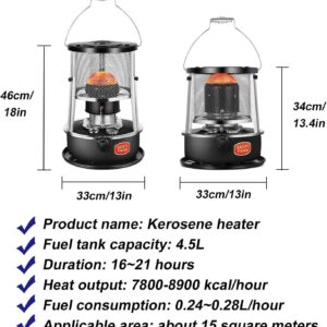 - ◈Special Design◈: Portable kerosene heater does not require electricity. You just need oil and you’ll have plenty of heat. The kerosene heater has the characteristics of quietness, energy saving, cleanliness and environmental protection. Our heaters have a capacity of 4.5 litres and are available in two capacities.