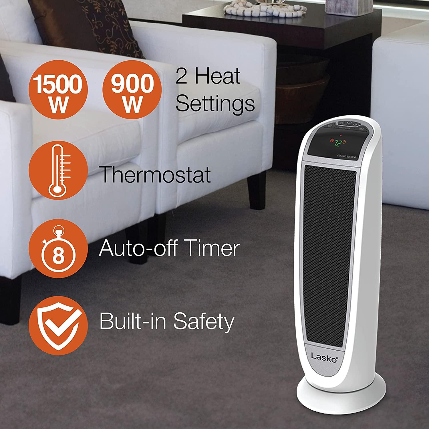 - 【2 Quiet Heat Settings and Adjustable Thermostat】This electric space heater features simple electronic controls and an easy to read digital display. Select from 2 heat settings (high 1500 watts / low 900 watts), plus a thermostat-controlled setting, it heats your space quickly and quietly.