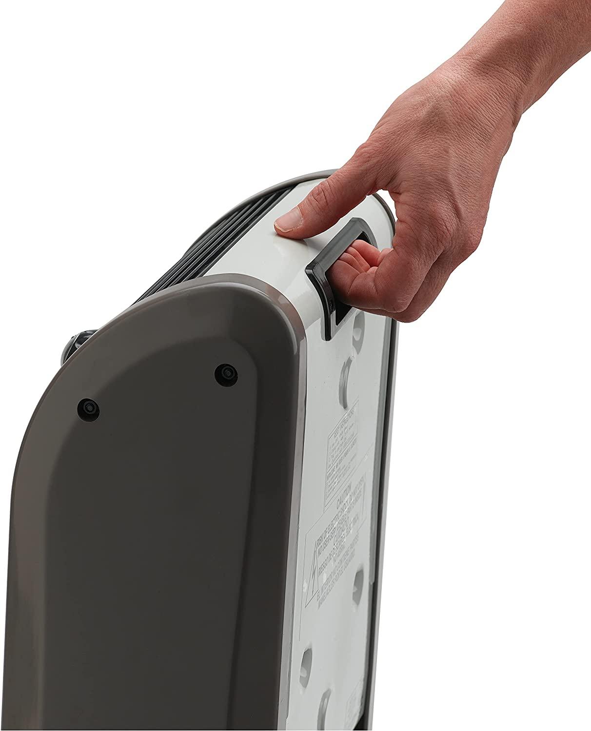- Thermostat-control knob and illuminated power switch. automatic overheat protection; tip-over safety switch. Measures 14″ X 6″ X 11.5″ tall