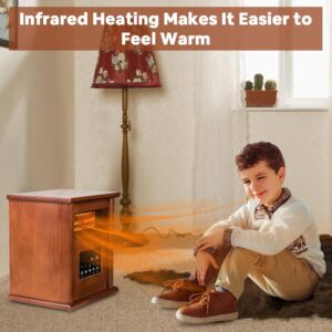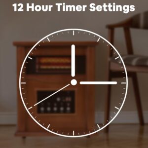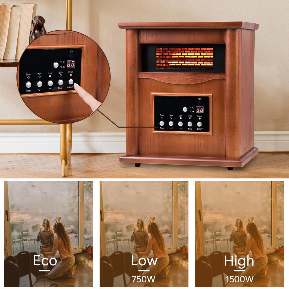 This infrared heater has a wooden frame that is comfortable to the touch and sturdy. The power of 1500W creates a warm and comfortable private space for you in a short time. Compared to other heaters, it also offers an ECO mode. Not only does this give you more warmth, it saves you more money. Our electric space heater is also equipped with a remote control and push button dual control system, which makes it more convenient for us to operate. The most important thing is multiple safety protection functions, including overheating protection, anti-dumping function, child lock, 12H timing, which can effectively protect the safety of you and your family, especially suitable for families with pets and children.Small and portable, the retro wood style makes it perfect for decorating a room as a decoration. What are you still hesitating about?