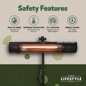 <p>Take control of your climate with the Infrared Electric Cold Space Heater from Lifestyle by Focus. Perfect for homes, backyards, garages, open-air restaurants, outdoor patios and decks, this indoor/outdoor heater is portable and comes with a tripod stand for sturdy mounting. It’s also mountable to a wall or ceiling.</p><h3>Cutting Edge Heating Technology</h3><p>Rather than simply warming the air like a conventional heater, the infrared rays emitted by the Lifestyle by Focus Infrared Electric Cold Space Heater get absorbed by the body, as well as items in your environment. As cool surfaces heat up, this heater raises the area’s ambient temperature. Infrared rays are more like sun rays than a standard heater. And this heating technology is more energy efficient.</p><h3>Convenient and Versatile</h3><p>Take the Lifestyle by Focus Infrared Electric Cold Space Heater anywhere you can imagine — add comfort to your home patio or yard, keep it in the garage, or use it to warm your place of business. A popular use is for restaurant outdoor seating. This portable heater can be placed indoors or outdoors. And infrared heating is a big plus when you don’t want to wait. Unlike the gradual heating of convection heaters, this heater warms you. up directly and quickly.</p><h3>Noise-Free Heating</h3><p>Infrared space heaters are silent, making them perfect for bedrooms or other rooms that need peace and quiet. That’s because instead of a fan, they work by simply radiating light.</p><h3>Rugged Design</h3><p>Built with durable stainless steel and aluminum housing, this heater is IP65-rated water resistant and weatherproof. It also features a built-in ETL certified overheating protection feature for safety. It’s designed with quality first in mind.</p><h3>Easy Setup</h3><p>The Infrared Electric Cold Space Heater comes with an easy-to-assemble tripod stand. It can also be mounted to a wall or ceiling, and it can be positioned vertically or horizontally. Brackets and other necessary installation tools are included in the box. And once it’s set up, the heater requires minimal maintenance.</p><h3>Adjustable Controls</h3><p>Included is an intuitive remote control with a power button and buttons to adjust the heat levels and timer settings. The timer can be adjusted from 0 to 9 hours. For those who have multiple units of the Infrared Electric Patio Heater, one remote will control all of them – no need to keep track of multiple remotes. The heater can also be controlled manually using the on-unit panel.</p>