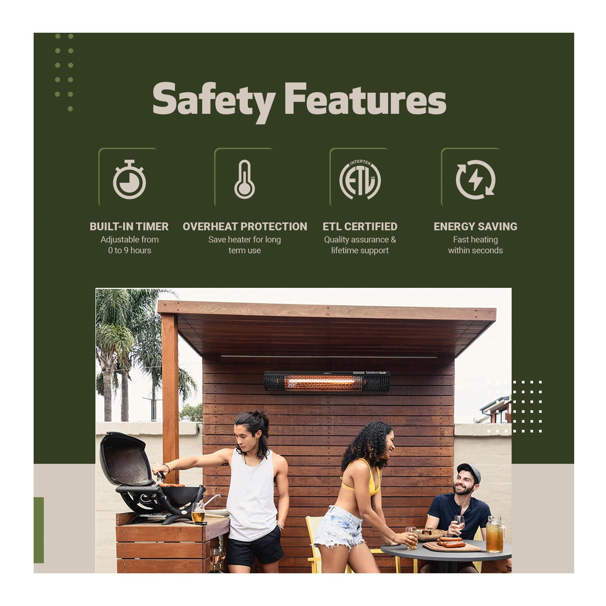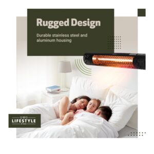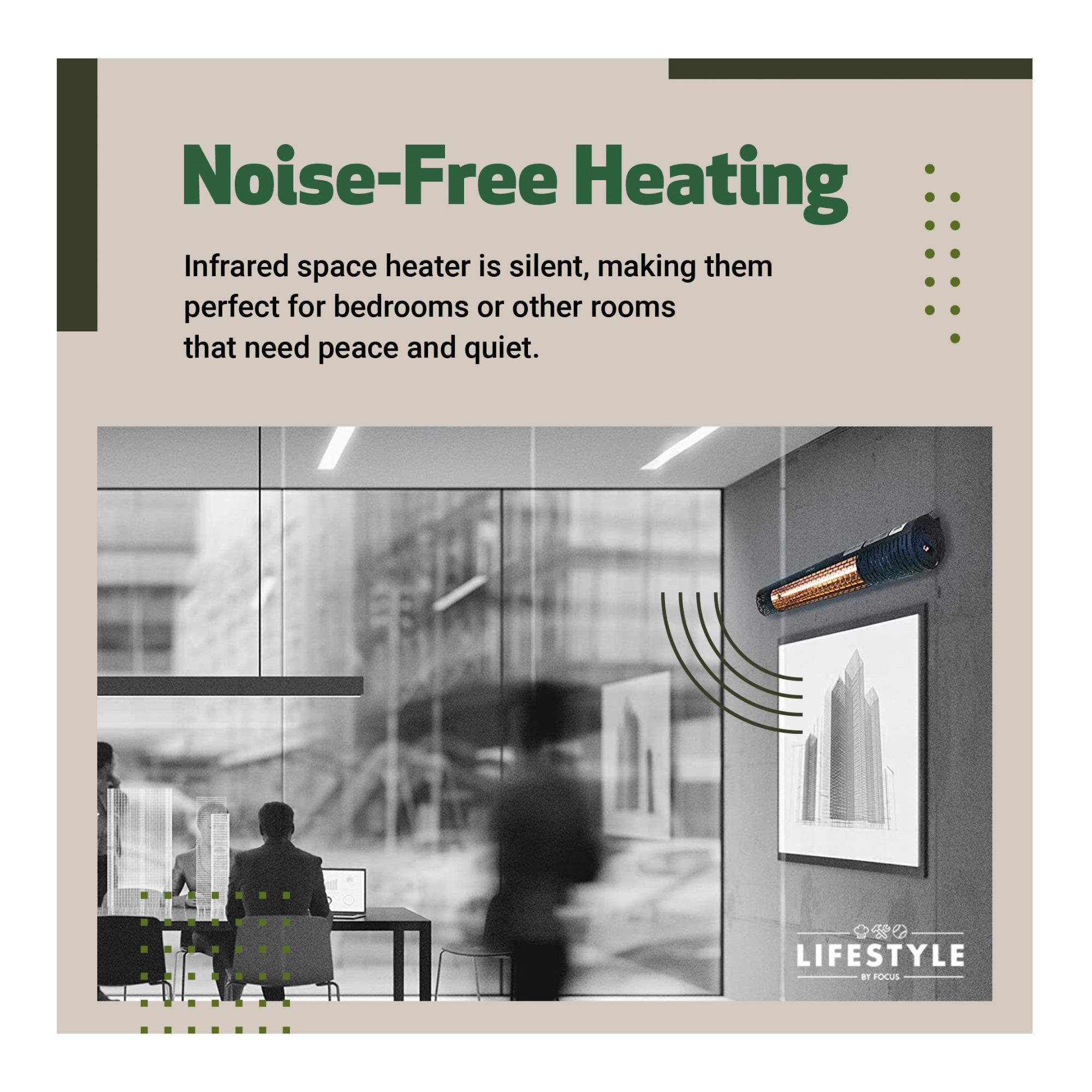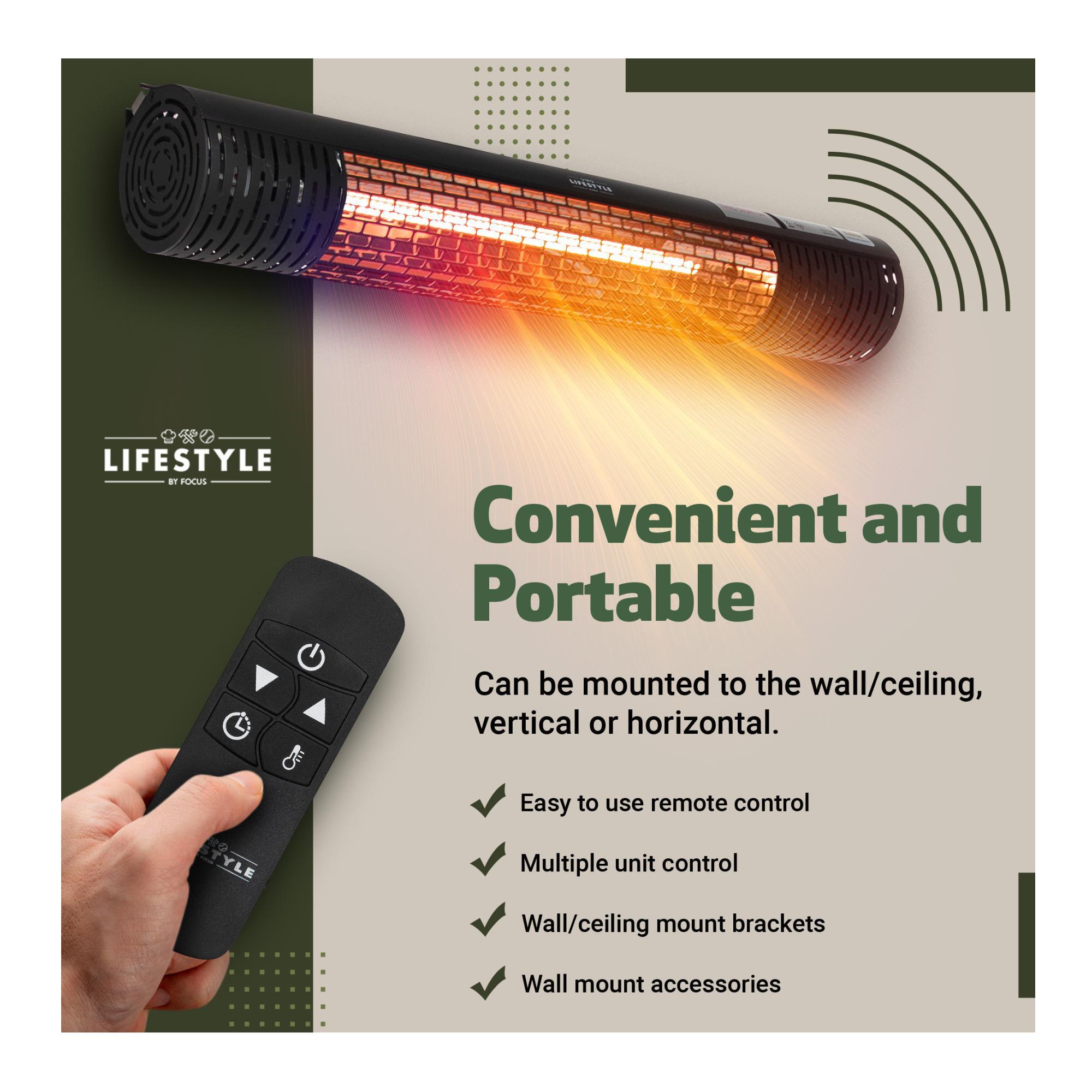 Take control of your climate with the Lifestyle by Focus Infrared Electric Cold Space Heater. Perfect for homes, backyards, garages, open-air restaurants, outdoor patios and decks, this indoor/outdoor heater is portable and mountable to a wall or ceiling.Cutting Edge Heating TechnologyRather than simply warming the air like a conventional heater, the infrared rays emitted by the Lifestyle by Focus Infrared Electric Cold Space Heater get absorbed by the body, as well as items in your environment. As cool surfaces heat up, this heater raises the area’s ambient temperature. Infrared rays are more like sun rays than a standard heater. And this heating technology is more energy efficient.Convenient and VersatileTake the Lifestyle by Focus Infrared Electric Cold Space Heater anywhere you can imagine, add comfort to your home patio or yard, keep it in the garage, or use it to warm your place of business. A popular use is for restaurant outdoor seating. This portable heater can be placed indoors or outdoors. And infrared heating is a big plus when you don’t want to wait. Unlike the gradual heating of convection heaters, this heater warms you. up directly and quickly.Noise-Free HeatingInfrared space heaters are silent, making them perfect for bedrooms or other rooms that need peace and quiet. That’s because instead of a fan, they work by simply radiating light.Rugged DesignBuilt with durable stainless steel and aluminum housing, this heater is IP65-rated water resistant and weatherproof. It also features a built-in ETL certified overheating protection feature for safety. It’s designed with quality first in mind.Easy SetupThe Infrared Electric Cold Space Heater can be mounted to a wall or ceiling, and it can be positioned vertically or horizontally. A mounting bracket is included in the box, along with all the necessary installation accessories. And once it’s set up, the heater requires minimal maintenance.Adjustable ControlsIncluded is an intuitive remote control with a power button and buttons to adjust the heat levels and timer settings. The timer can be adjusted from 0 to 9 hours. For those who have multiple units of the Infrared Electric Cold Space Heater, one remote will control all of them – no need to keep track of multiple remotes. The heater can also be controlled manually using the on-unit panel.