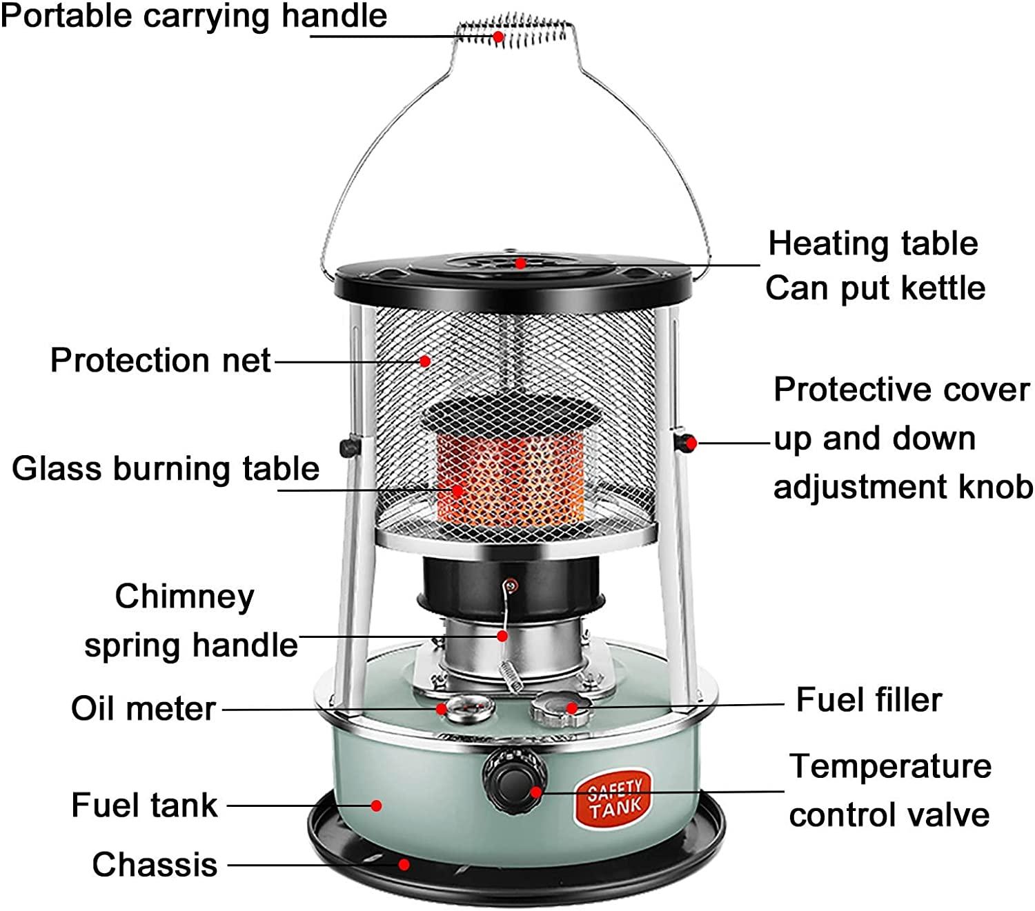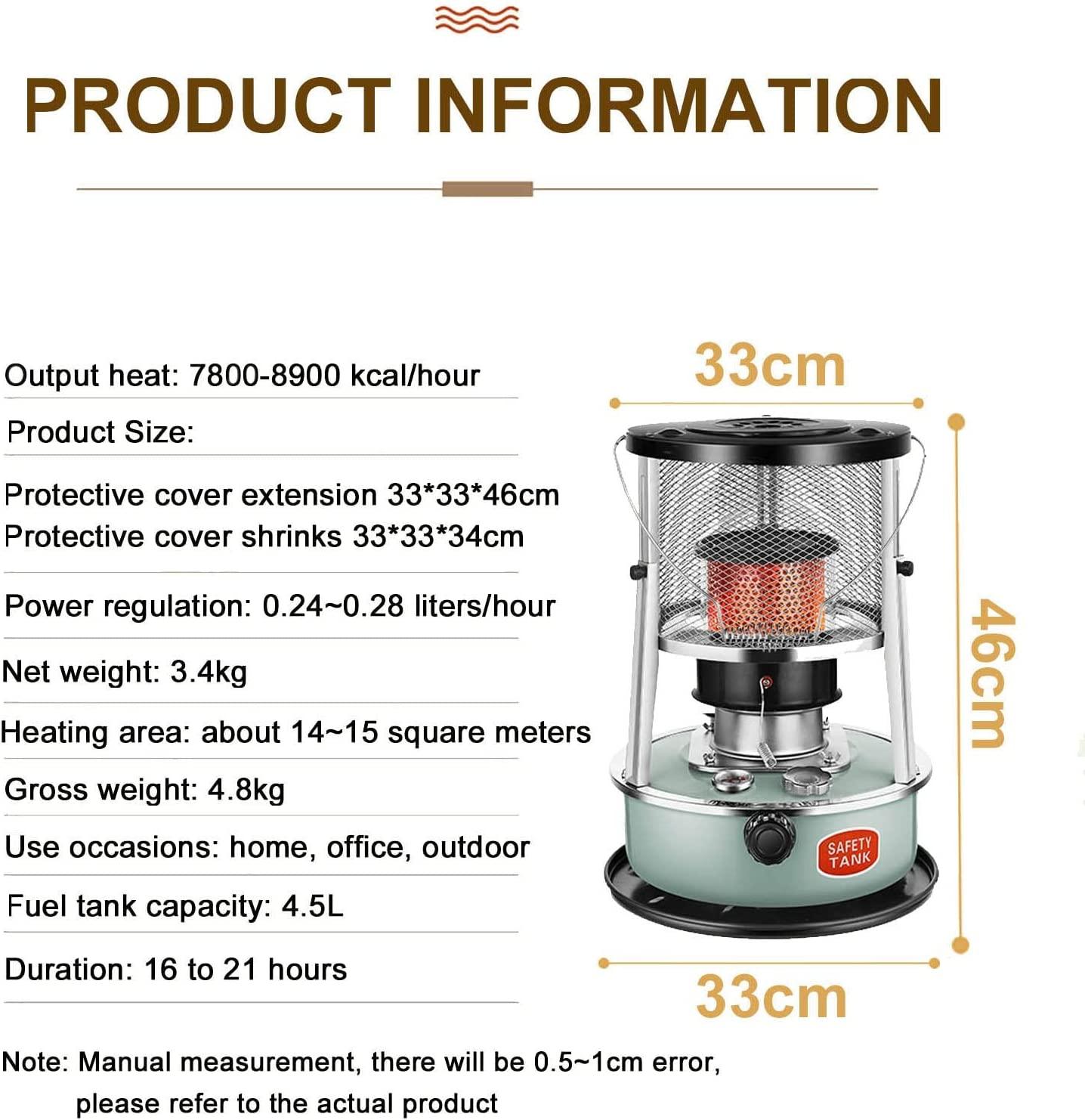 - ➤[MORE EFFICIENT KEROSENE HEATING]: The combustion chimney of the indoor portable non-electric kerosene stove is made of special metal to ensure full combustion of kerosene, faster and more efficient heating. The fuel consumption per hour is 0.24-0.28L, the heating time can last for 16-21 hours, and the space of 14-15m2 can be heated.