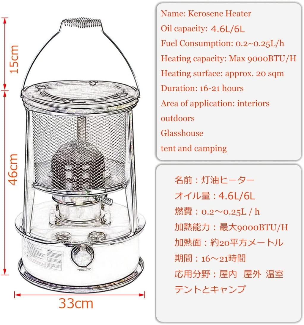 - 【Package quantity】 Kerosene heater*1, storage bag*1, spare wick*6, spare rotation*1, funnel*1, oil pump*1, gloves*2.