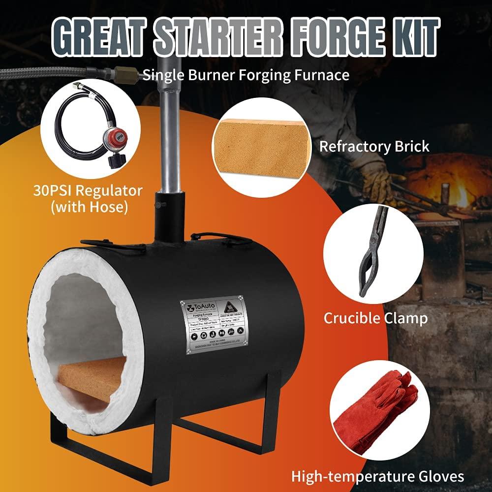 QUICK & EFFECTIVE BURN: Comes with a 10000W power high efficient single burner to heat the metal furnace up to 2,000°F with ease which could forge a φ6CM iron rod temperature in 15 minutes or even less. The unique oval design allows workpieces to heat evenly and exposes them to the flame’s “sweet spot”.Great value for anyone looking to get into blacksmithing!