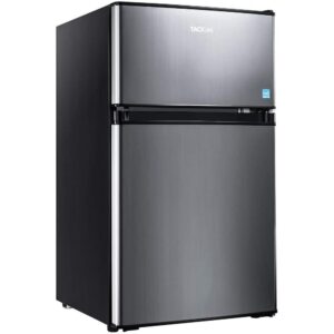 - SMALL SIZE WITH LARGE CAPACITY: The fridge is small and compact(17.3 x18.3 x32.7 inches), which is suitable for different environments — offices, apartments, kitchen, garages, college dorm, protected outdoor spaces. 3.1 cubic feet capacity, with 0.9 cu.ft freezer can be used storage your ice cream or frozen food and 2.2 cu.ft fresh-keeping fridge keep drinks, fruits, vegetables and other food cool
