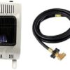 - 30,000 BTU per hour for use with propane gas and heats up to 750 sq. ft.