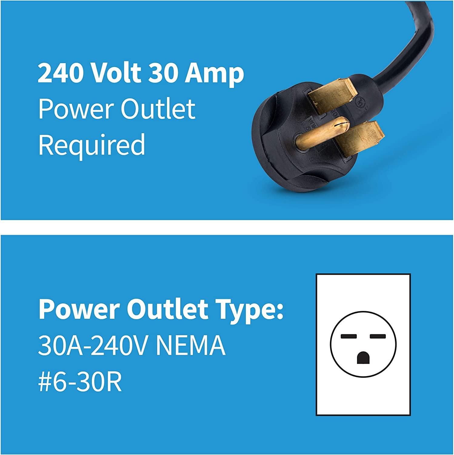 - PLUG TYPE – The UL-certified plug is 30-amp and has 3-prongs to fit in a dedicated 240-volt outlet.