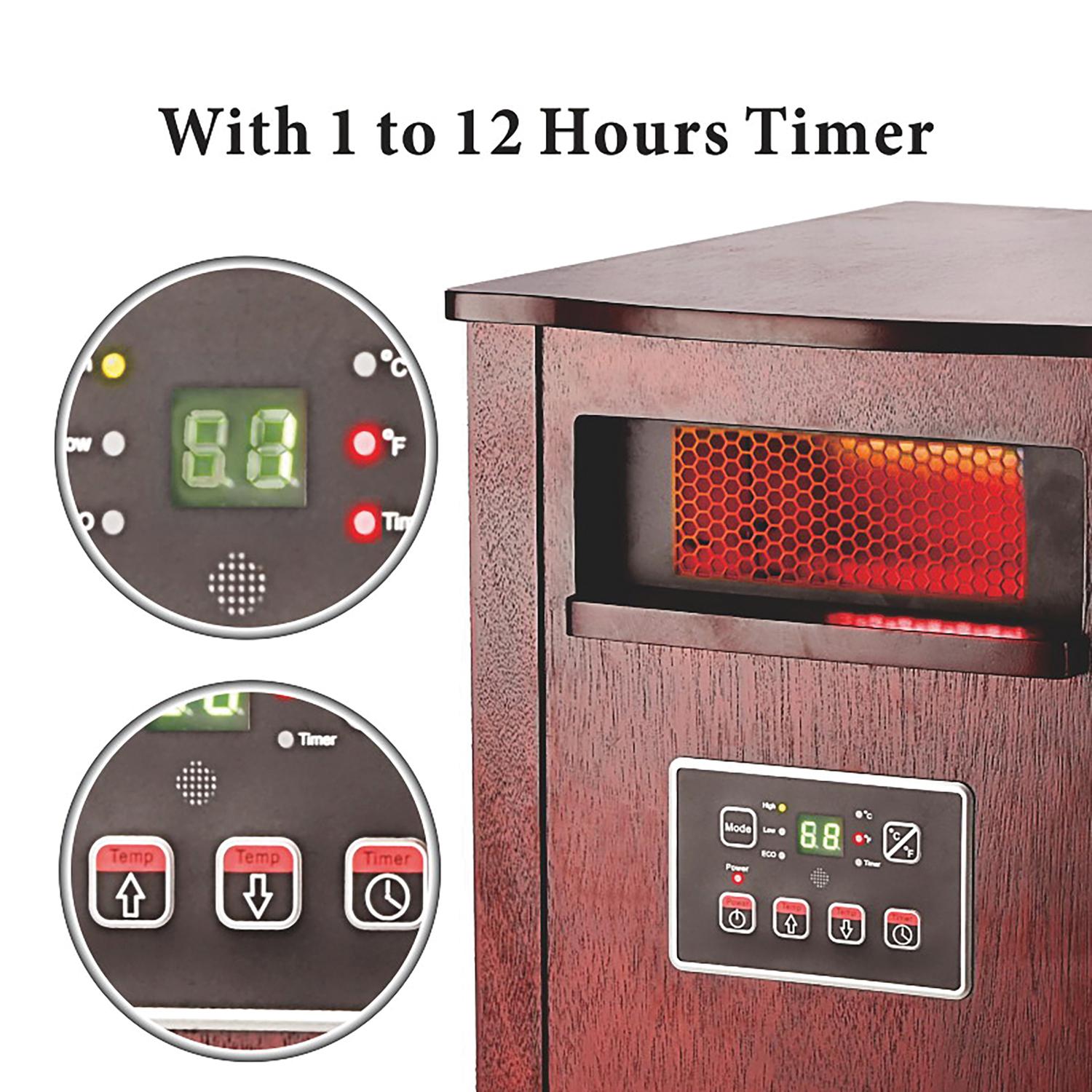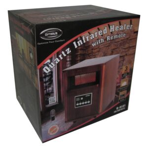 Need heat on the go? This Optimus 3-Setting 1,500-Watt-Max Portable Wood-Cabinet Infrared Quartz Heater with Remote, LED Display, and Wheeled Base is a smart, safe, and savvy way to heat up the living spaces you hibernate during the winter with soothing, comforting heat. It has a slick design so it doesn’t take up too much room and is ideal for medium or large rooms like living room, family rooms and as a heater for a bedroom. It features 2 levels of heating and an ECO setting. The overheat protection circuit and tip-over safety switch help to make sure that safety is never put on the back burner.
