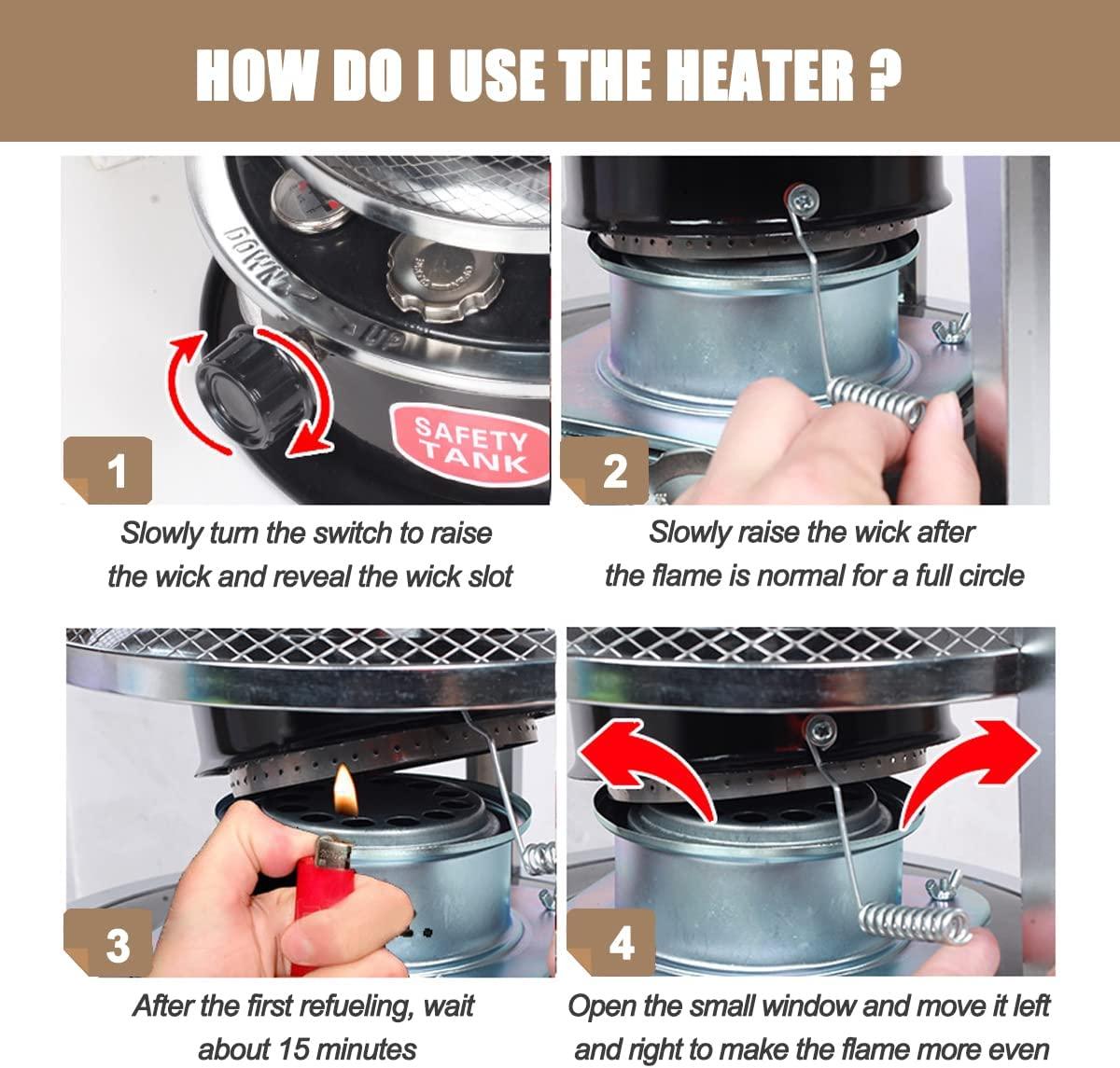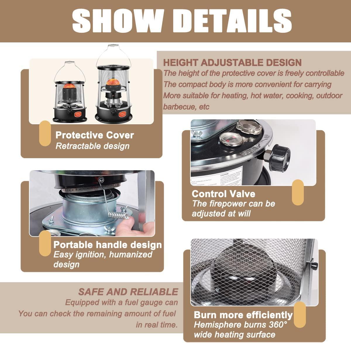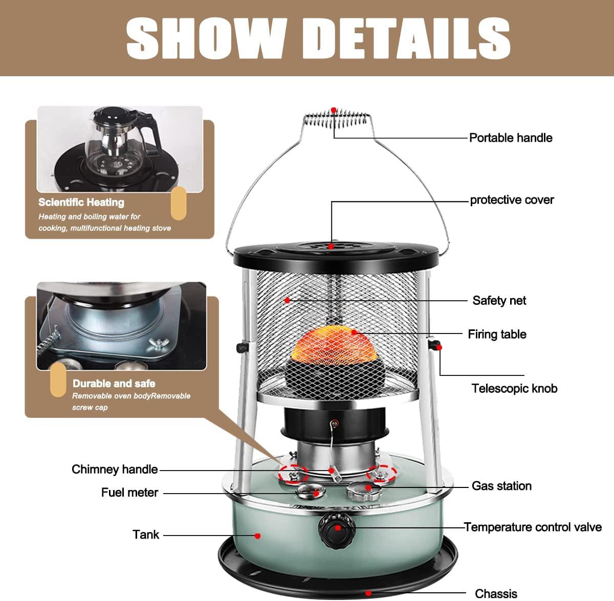- More Efficient Kerosene Stove: The combustion chimney of the kerosene heater made of special metal so that the kerosene can be fully burned. The kerosene heater has a chimney handle, and you can regulate the flame by turning the chimney handle, and the heating will be faster and more efficient.