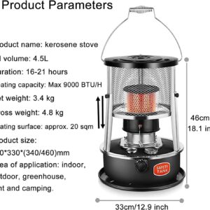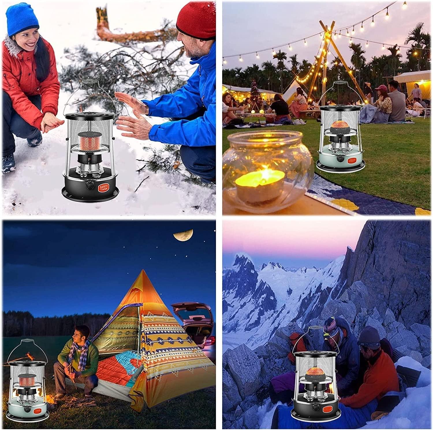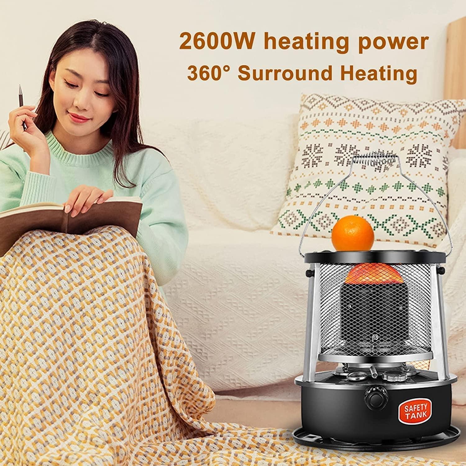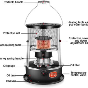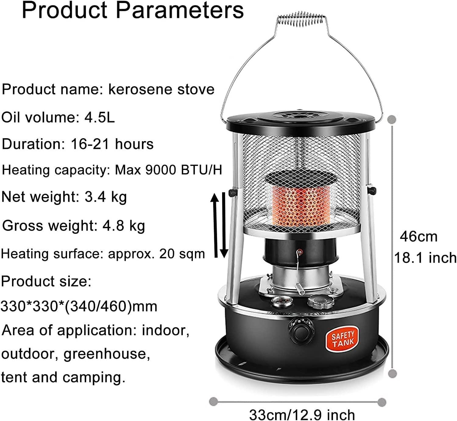 - 【Safe Energy-saving Design】: Portable kerosene stove heater, no electricity needed. It has the functions of automatic closing of the tilt angle (reverse tilt angle), automatic fire extinguishing and hypoxia protection, safe to use.