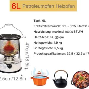 - ☞【More efficient kerosene heating】The combustion chimney of the indoor portable kerosene stove without electricity is made of special metal, which makes the kerosene burn completely, and the heating is faster and more efficient. The oil heater has 6 wicks and 2 gloves.We have two options of 4.6L and 6L, please purchase according to your needs.