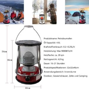 - ❦Heating function: The maximum calorific value of the kerosene stove is 9000 BTU/H, the calorific value is high, and the heating area is large. The heating area can cover a space of 20 square meters.
