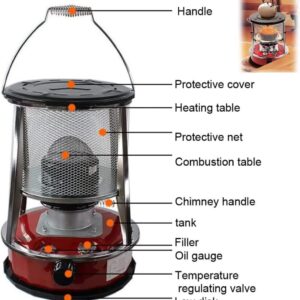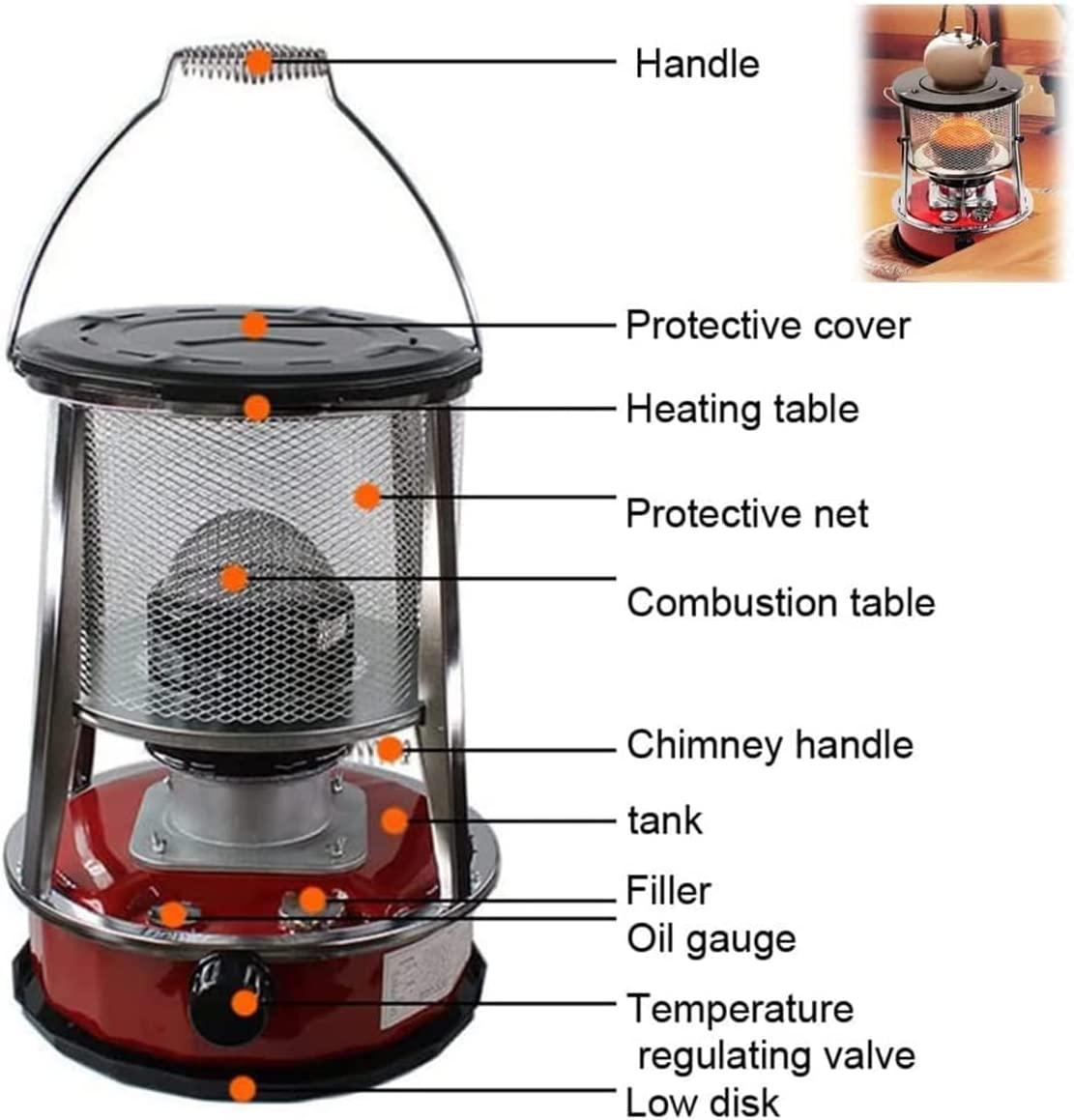 - ✿Efficient: The camping heater uses kerosene as fuel, so that the wick is fully immersed in kerosene, so that it is fully burned and heated, the heating area is large, and the maximum calorific value is about 9000 BTU/H.