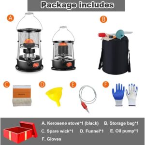 - 【Package Includes】Kerosene Stove Burner *1, storage bag*1, spare wick*1, spare rotary switch*1, funnel*1, suction tube*1.