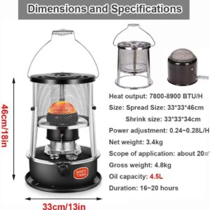 - 【More Efficient Heating】Kerosene heaters is made of special metal, so that the kerosene can be fully burned, and the heating is faster and more efficient.Fuel tank capacity 4.5L.