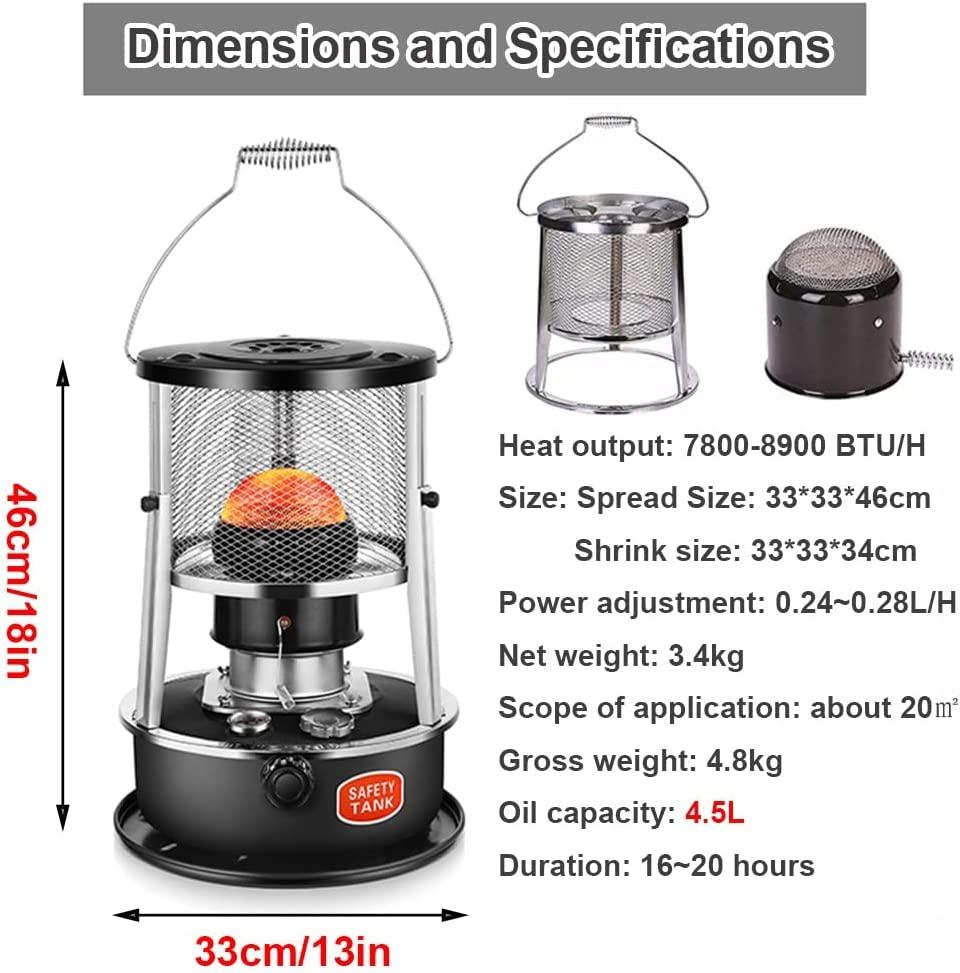 - 【High Calorific Value】High calorific value and large heating range. The maximum calorific value is 8900 BTU/H (equivalent to 3000W), and the fuel consumption per hour is 0.24~0.28L. Can make the room of about 20 square meters rise rapidly.