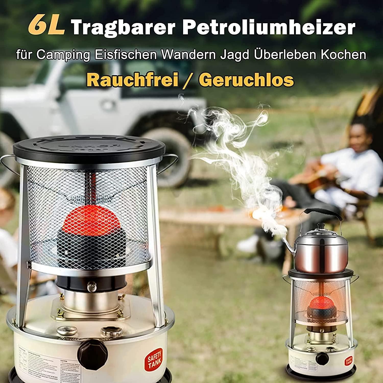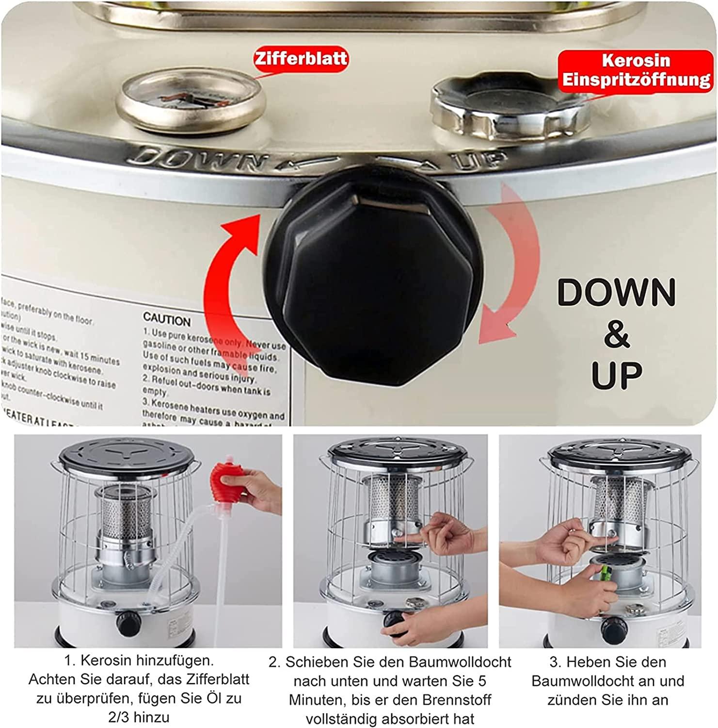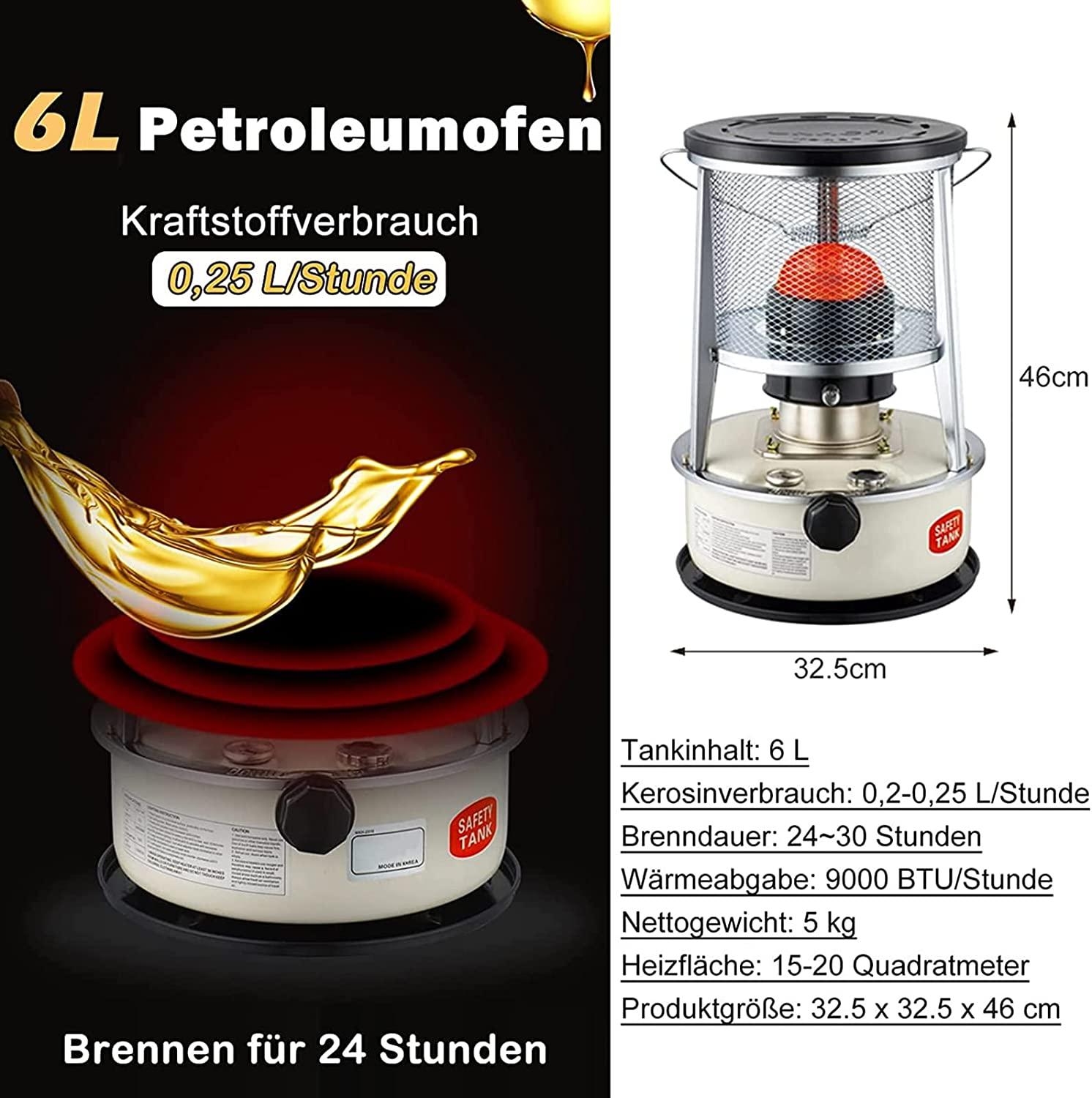 - ▲ Longer Heating Times: 6 litre petroleum oven with a large capacity and an oil consumption of 0.2 – 0.25 litres per hour as well as a longer heating time of 24 to 30 hours. The petroleum oven provides up to 9000 BTU (3000 W) heat output and heats a room of 15-25 m2.