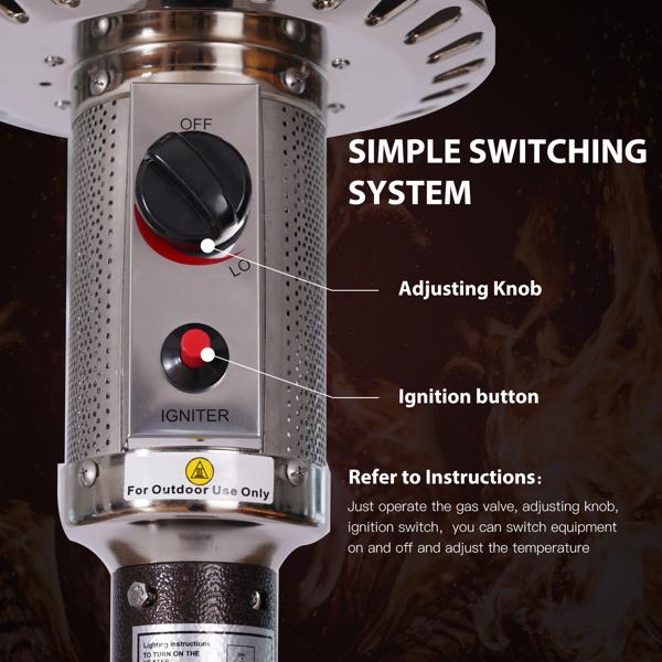 6.Large thermal radiation range:Heat range up to 20 feet in diameter.Emits 46,000 BTU of steady warmth.