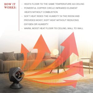 - HEAT DOESN’T DRY OUT THE AIR – Its unique Copper Circle Heating Element moisturizes the air. While adding oxygen as it heats up in 3s ensuring whole room even heating. The thermal conductivity of copper is 20 times that of stainless steel. Meaning: its copper transfers heat 20 times faster. So you can feel the heat on your body and quickly. It’s amazing how long the heat stays in the copper and continues to warm the room.