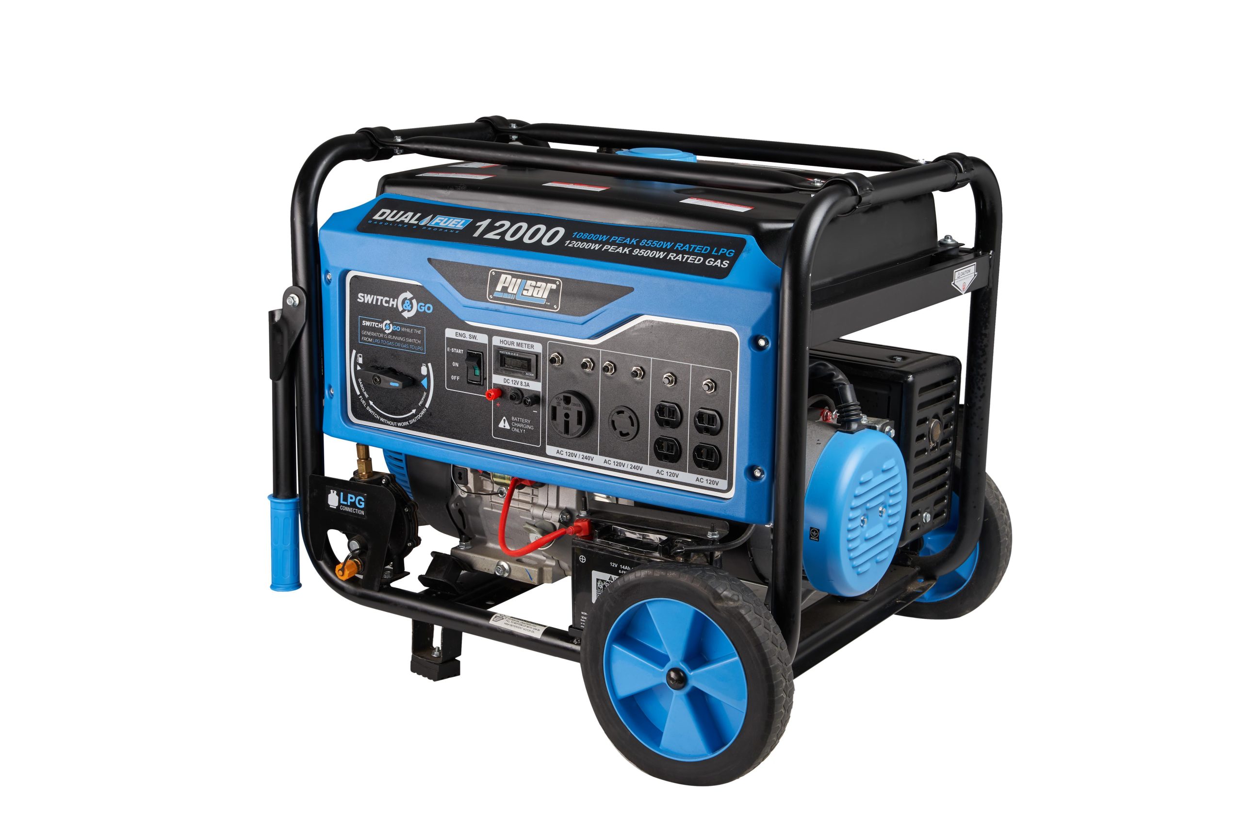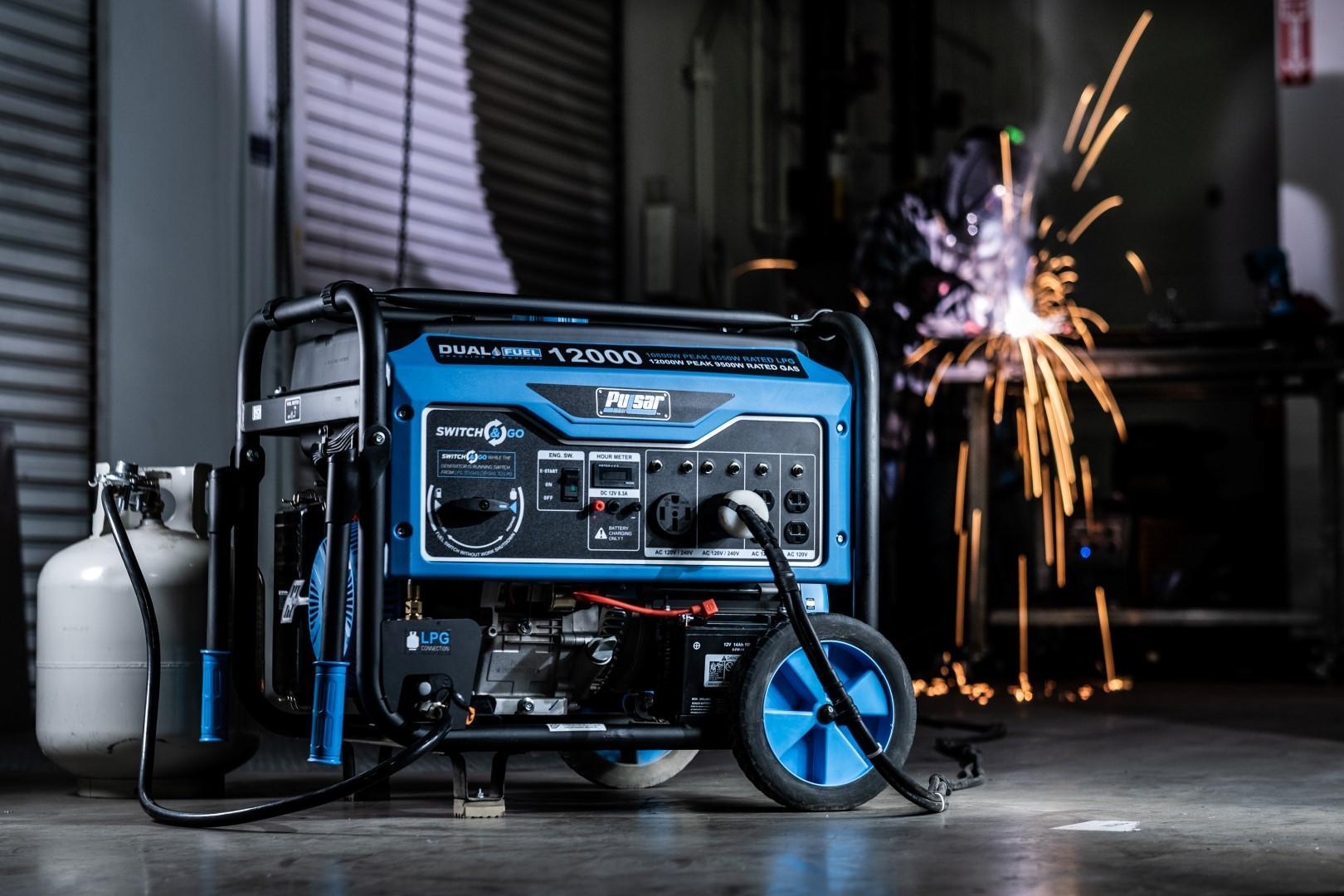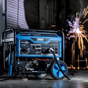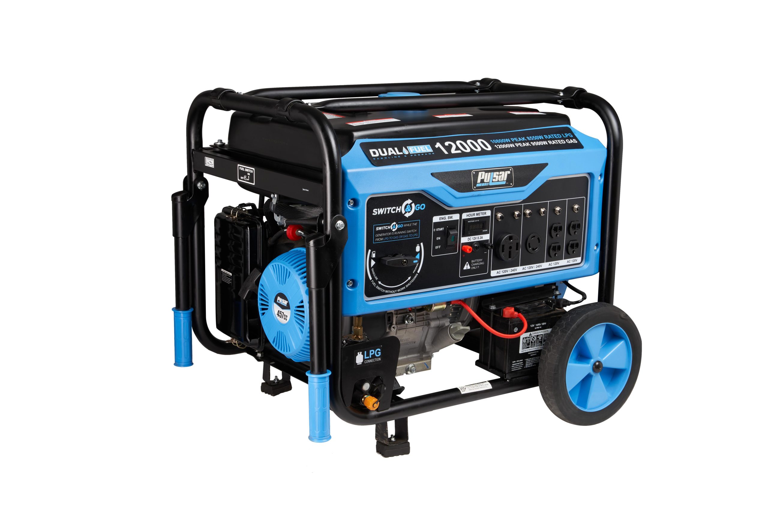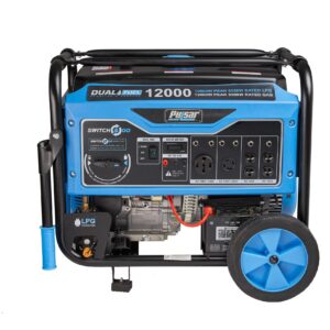 Pulsar’s PG12000B Dual Fuel Portable Generator was built to keep you out of the dark during the next power outage. The dual fuel feature with the ability to run on gasoline or liquid propane to provide you with more options and peace of mind in the event of a natural disaster. It’s 457cc, single cylinder, 4-stroke, OHV engine produces 12,000 Peak Watts/9,500 Running Watts on Gasoline and 10,800 Peak Watts/8,550 Running Watts on LPG. The extended run-time and output make it an ideal source of backup power for running large appliances and other electronic devices, so you can comfortably weather the storm. The PG12000B’s convenient Switch & Go technology allows you to seamlessly transition between fuel sources while in use without you missing a beat. It’s durable steel frame, 10” never-flat wheels, and convenient drop-down handles make storage and maneuvering easier than ever. When you need the convenience of portability and the power to perform, the Pulsar PG12000B has you covered!