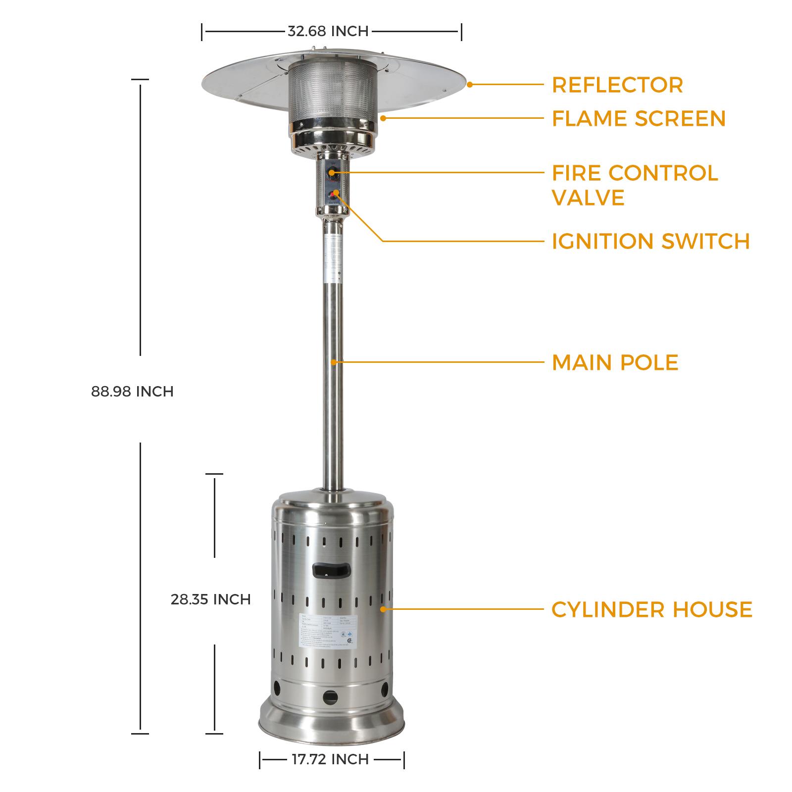 RTR 46000Btu Propane Stainless Steel Mushroom Outdoor Patio Heater, With Two Smooth-Rolling Wheels,With Hose Set,With Black Cover,Pole In Two Pieces(Upper And Bottom)