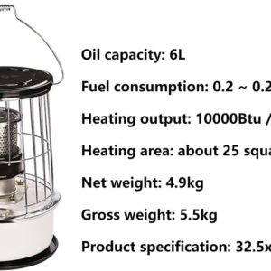 - Convenient – Easy to use automatic ignition and one-touch shut-off. The maximum calorific value is 9000BTU/H (equivalent to 2800W), and the fuel consumption per hour is 0.2L/hr. It can quickly heat up a room of about 20-30 square meters.