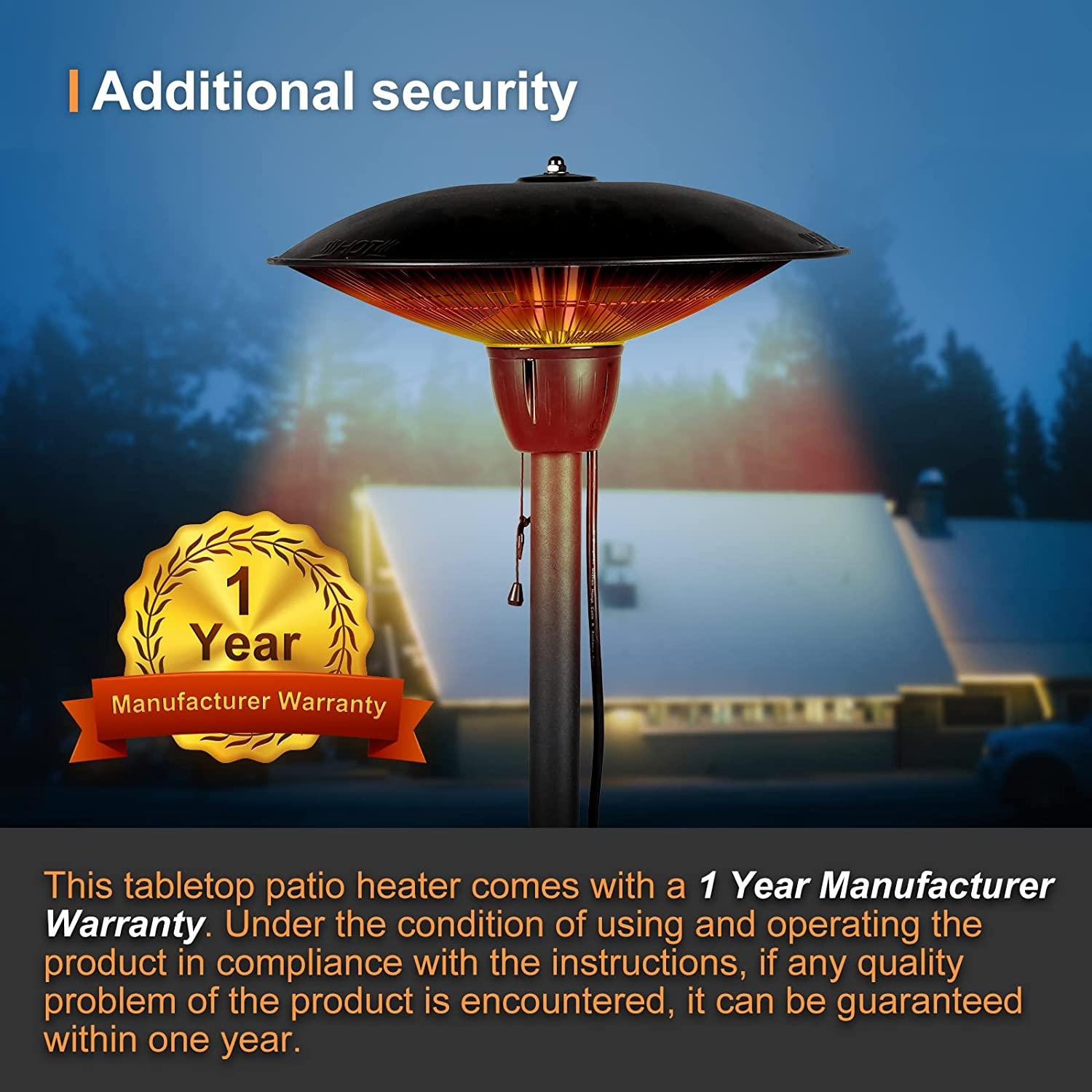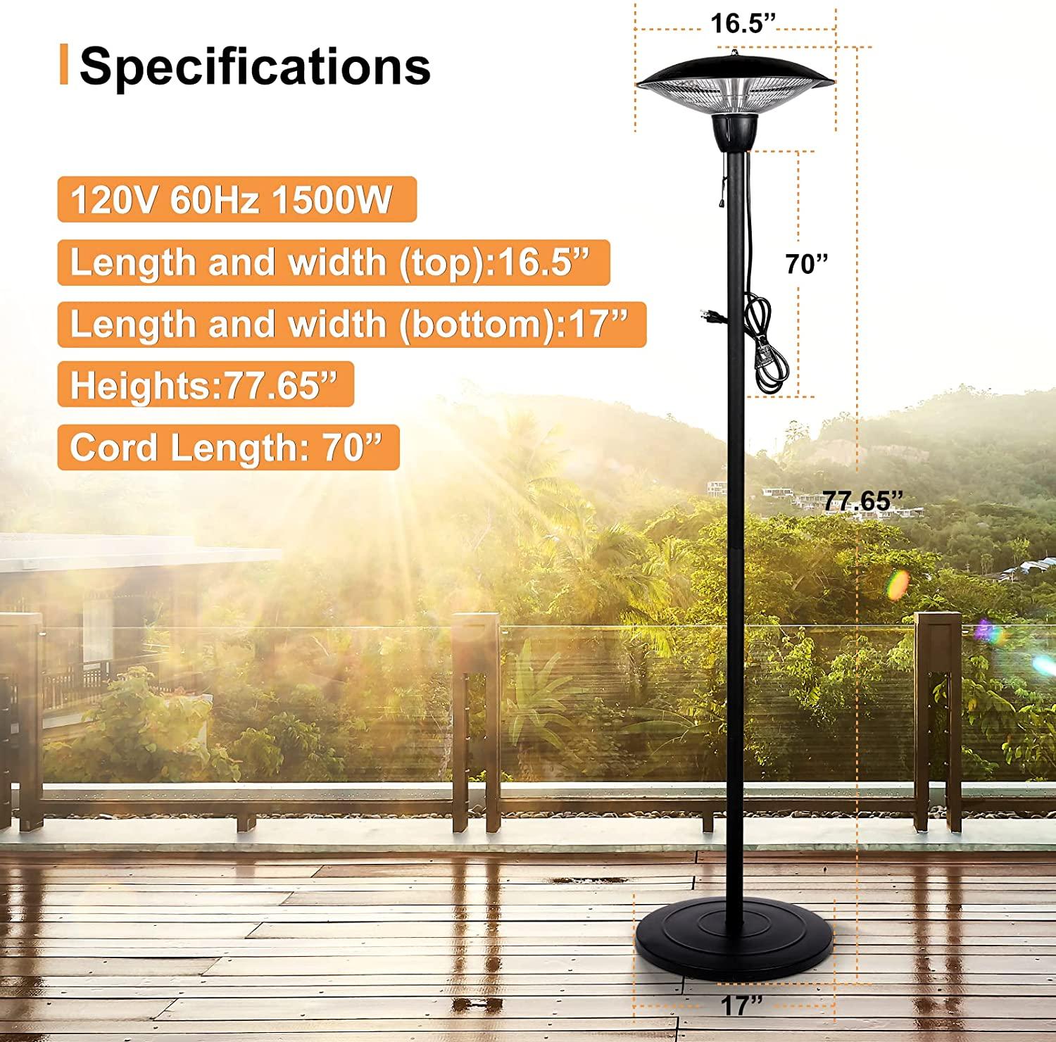 Simple Deluxe 1500W Patio Electric Heater,Outdoor Patio Heater Infrared Heater for Camping,Black.Great quality and good heat output It makes chilly days comfortable, You can run the burner and radiates very comfortable heat. Easy to ready heater for use very efficient . it takes less then 2 seconds to light and about 10 seconds to get hot.and the area it can heat up is incredible.Let you get warm everywhere in the most convenient way.Light weight and easy to move: This Table Top Patio Heater is designed for convenience and style. Its dimension is 26 in H x 17 in dia. and only weight 25lbs.The heater is surprisingly sturdy for something so relatively lightweight – it is very easy to move around, yet moderate wind doesn’t even shake it.Safety protection: : Electric Patio Heater pass ETL, CE, and IP34 certification. The Outdoor Heater covers the heating element to prevent pets or children from being burned when they accidentally touch the surface of the Infrared Heater. In addition, the Infrared Patio Heater has a stable circular base to avoid tipping over. Even if it is dumped, it will automatically cut off the power. The Patio Heater also has to overheat protection to protect your electrical safety.