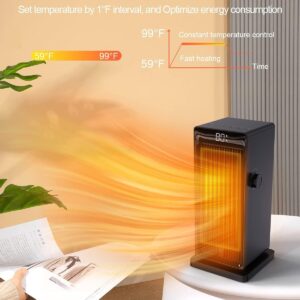 - 【ECO energy-saving & Digital thermostat 】You could set a temperature between 59-99°F by 1°F interval, the space heaters for indoor use will heat up to and cycle on/off automatically to maintain the temperature you set by detecting the ambient room temperature, in this way to optimize energy consumption. You will find that your electricity bill decreased obviously with this portable heater with digital thermostat.
