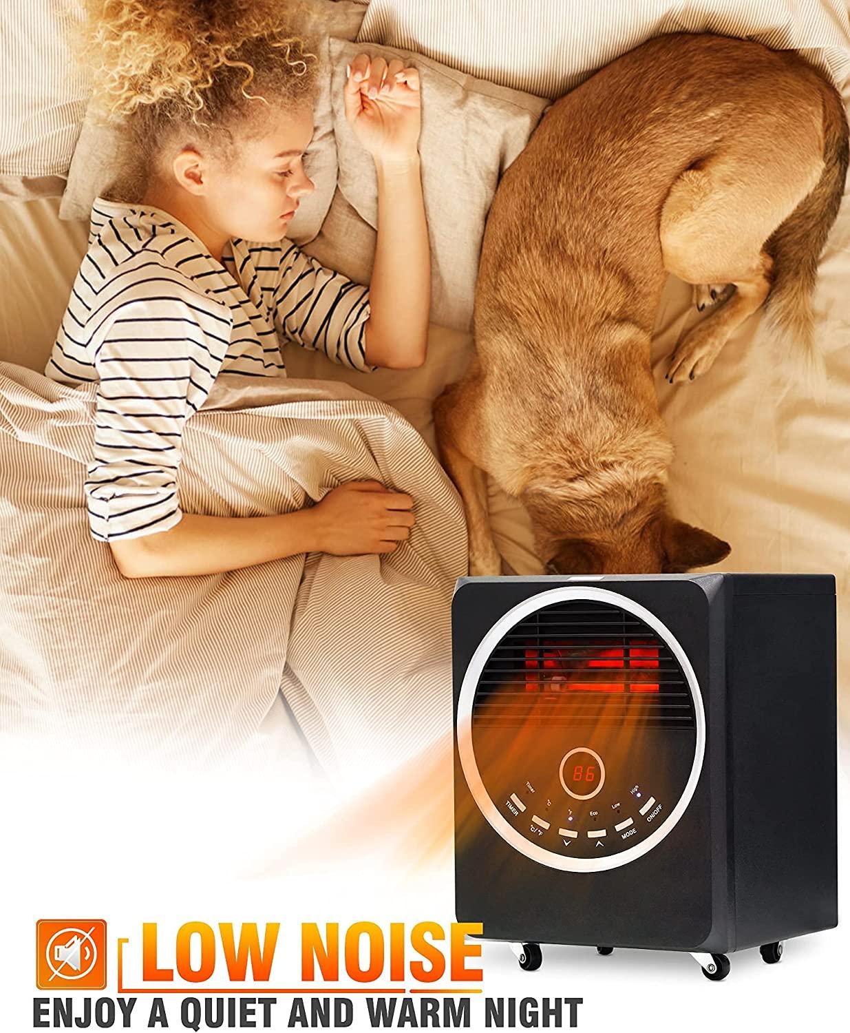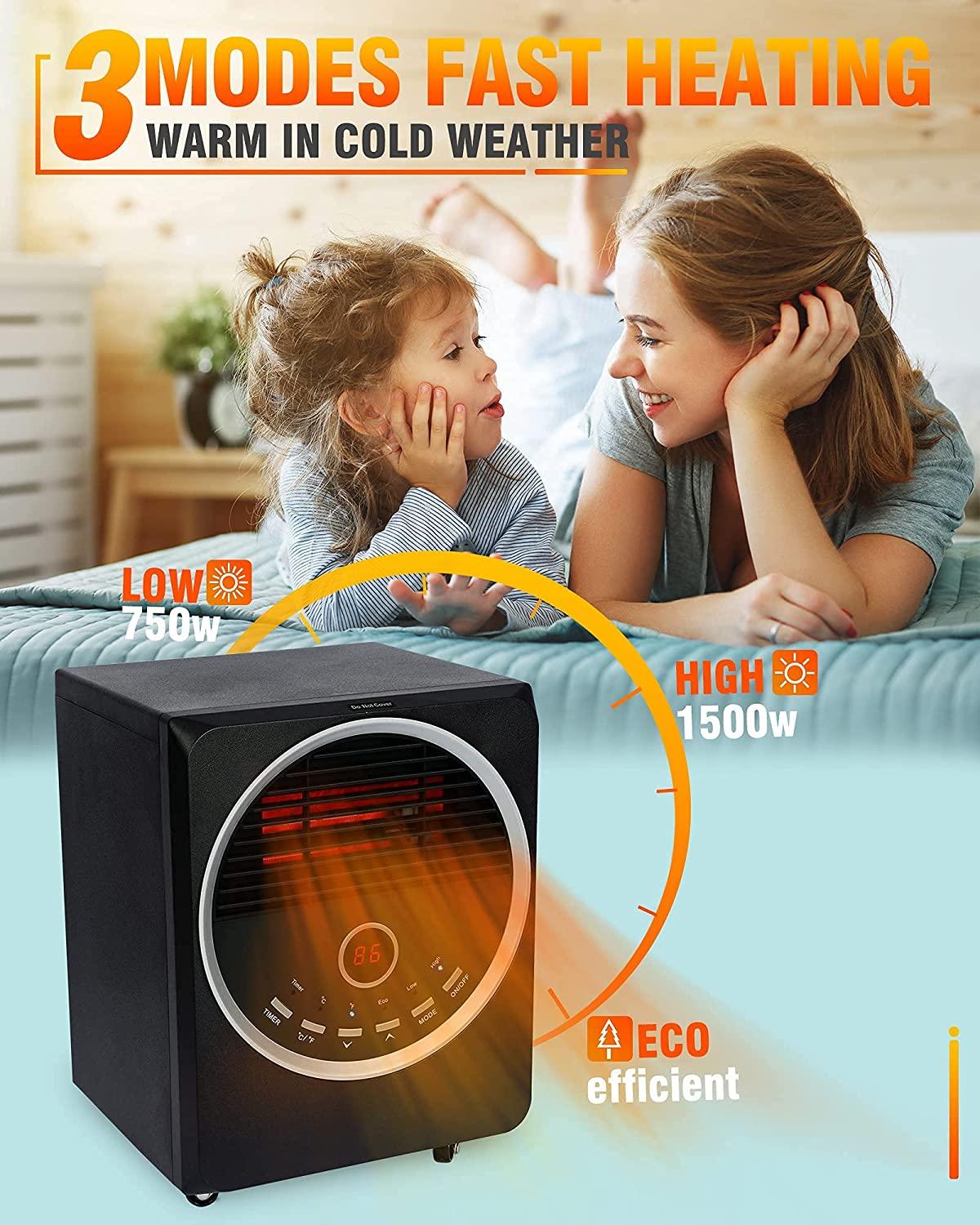- 【PROVIDING EFFICENT WRMTH TO YOU】: This electric indoor space heater equips with two infrared heating tubes can heat up in 3 seconds. High mode (1500W) for heating up your home large room. Low mode (750W) perfect for small room like bedroom, pet house. ECO mode will cyclically on and off to maintain the warmth, will contribute to your electricity bill saving.