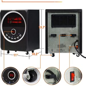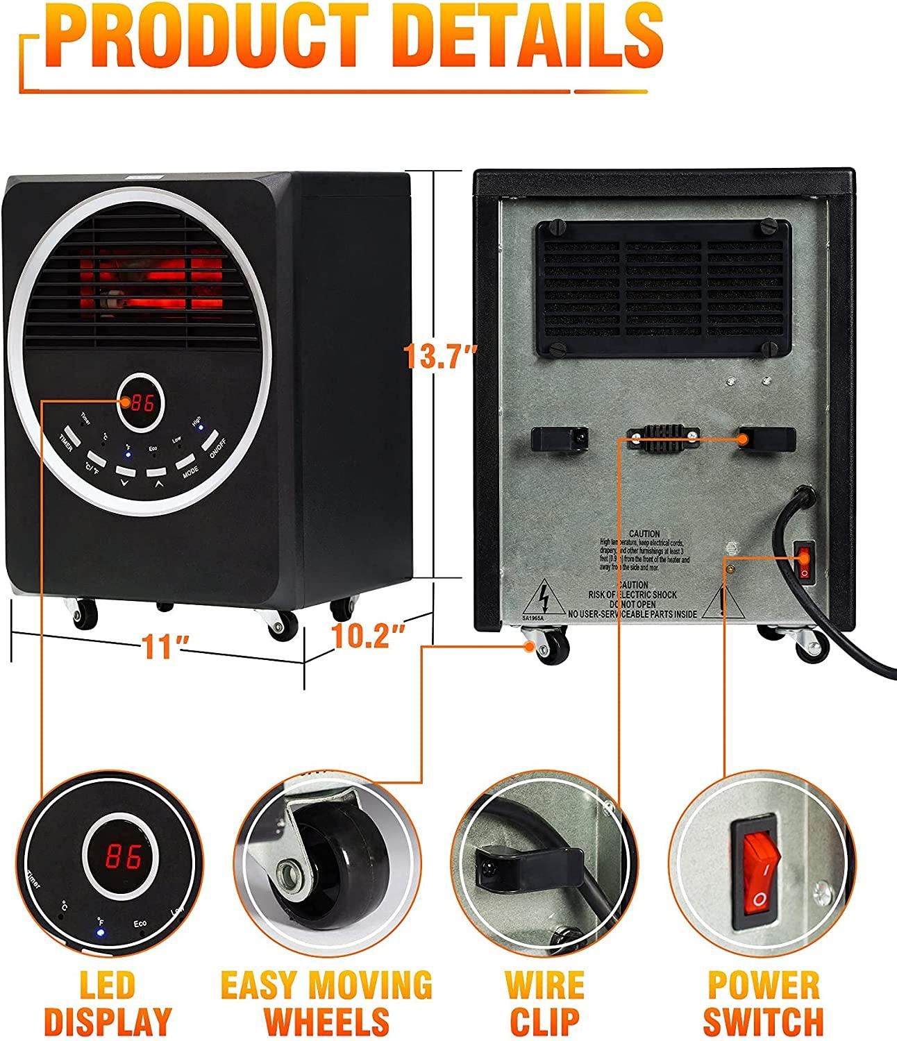 - 【POWERFUL SPACE HEATER】: This space heater for indoor use is 120V (60Hz) and 1500 watts. Built-in 12 hours timer for easy to set the time to automatically shut down. The LED display for easy to read. There are wire clips on the back of the infrared heater for easy to storage the power cord. Comes with 1 year warranty.