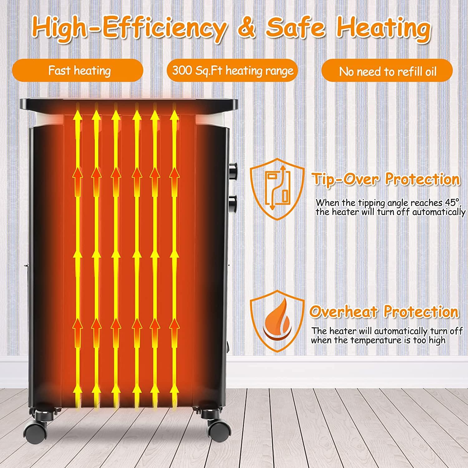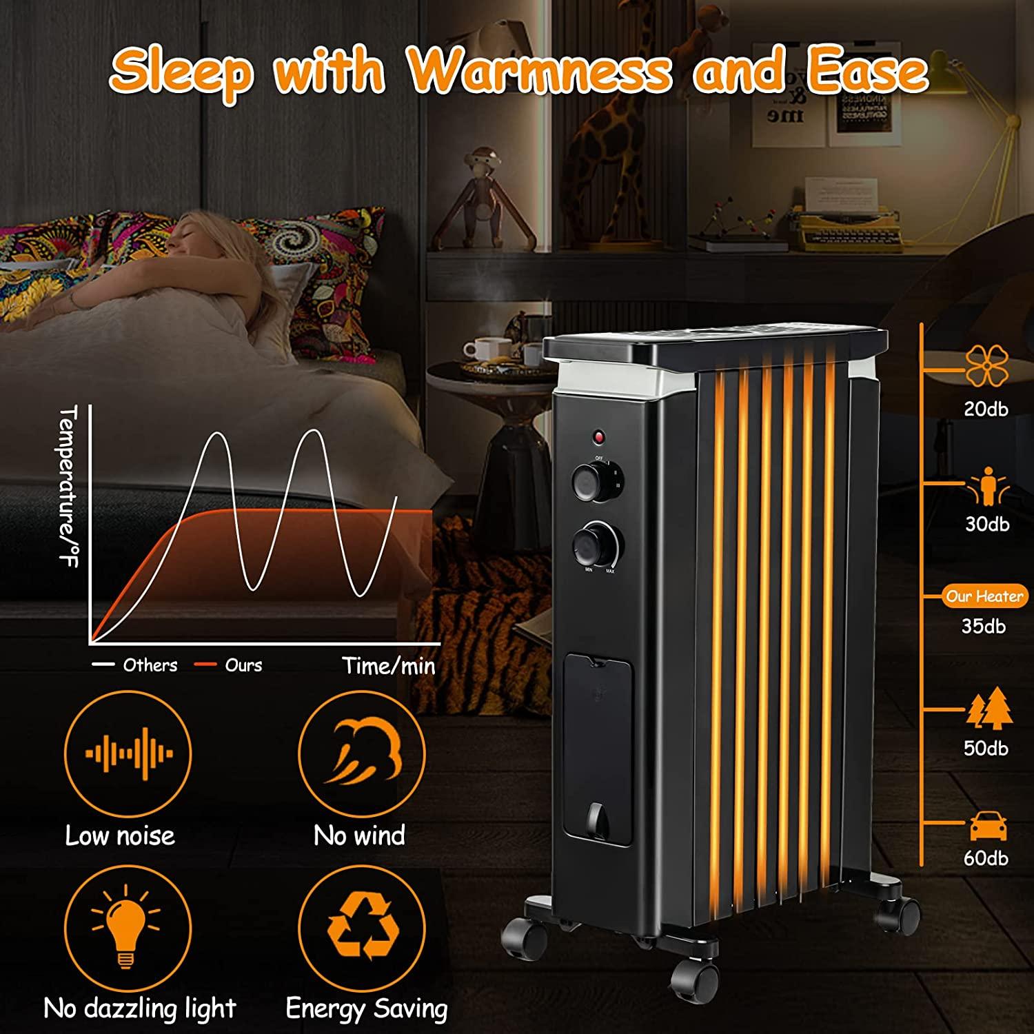 - Energy Saving & Quiet Working: The oil heater creates a soothing and warm atmosphere for you to relax, and won’t make out any disturbing sounds. And there is no wind or dazzling light during operation, so you can sleep at ease. Furthermore, the heater is designed with a permanently-sealed oil reservoir, and thus you don’t need to refill oil, which is quite energy-saving.