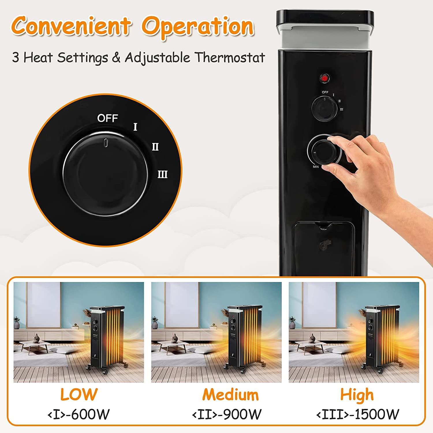 - 3 Level Efficient Heating: This oil filled heater features 3 heating levels: 600W, 900W and 1500W. You can turn the control knob to achieve different heating effects. Furthermore, the thermostat control will keep your room always in a suitable temperature for long-lasting comfort.