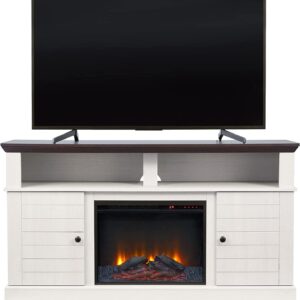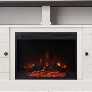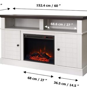 Teamson Home Eliana Remote Control Electric Fireplace Wooden TV Stand Storage Cabinet with 2 Doors Cubbies and Adjustable Shelves for TVs up to 65 inch, 60 inch Width, Dark Oak and White