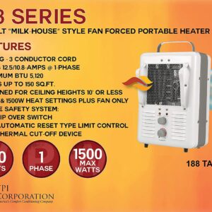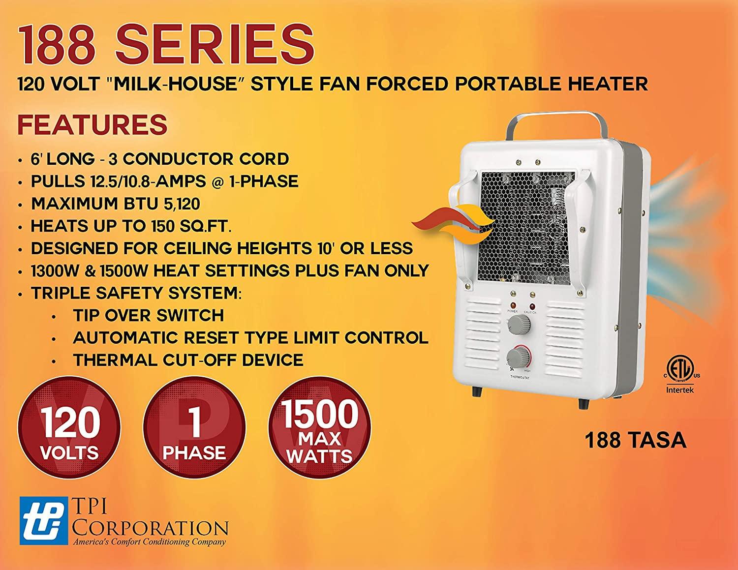 TPI Corporation 188TASA Fan Forced Portable Heater – Milk House Style Fan, 1500/1300W, 120V, Durable Winter Care Accessory. Genuine Heating Equipment