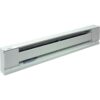 Key Features;Painted 22 ga steel front with 20 ga junction boxes located on each end of the heater;Over-temperature thermal limit extends entire length of heated area;A full length wireway provided along the back of the heater – enclosed conduit available;Heater can be mounted to the wall by using the key hole knockouts every 4 in at the back of the heater;Optional in-built thermostats field installed in the junction box;Electric baseboard heaters ivory finish lgth 4 feet watts=1000/750 Stainless steel heating element and aluminum fins. Painted 22 gauge steel front with 20 gauge junction boxes located on each end of the heater – junction boxes contain quick connect cable clamps and 6 inches ground lead wires. Over-temperature thermal limit ext ends entire length of heated area. A full length wireway provided along the back of the heater. Safely installs with standard 60 degrees Celsius building wire. 240 volts. U.L. Listed. Thermostat Sold Separately.Stainless steel heating element and aluminum fins. Painted 22 ga steel front with 20 ga junction boxes located on each end of the heater, junction boxes contain quick connect cable clamps and 6 in ground lead wires. Over-temperature thermal limit extends entire length of heated area. A full length wireway provided along the back of the heater. Safely installs with standard 60 deg C building wire. 240 V. UL listed. Thermostat sold separately. Stainless steel heating element and aluminum fins. Painted 22 gauge steel front with 20 gauge junction boxes located on each end of the heater – junction boxes contain quick connect cable clamps and 6 inches ground lead wires. Over-temperature thermal limit ext ends entire length of heated area. A full length wireway provided along the back of the heater. Safely installs with standard 60 degrees Celsius building wire. 240 volts. U.L. Listed. Thermostat Sold Separately.