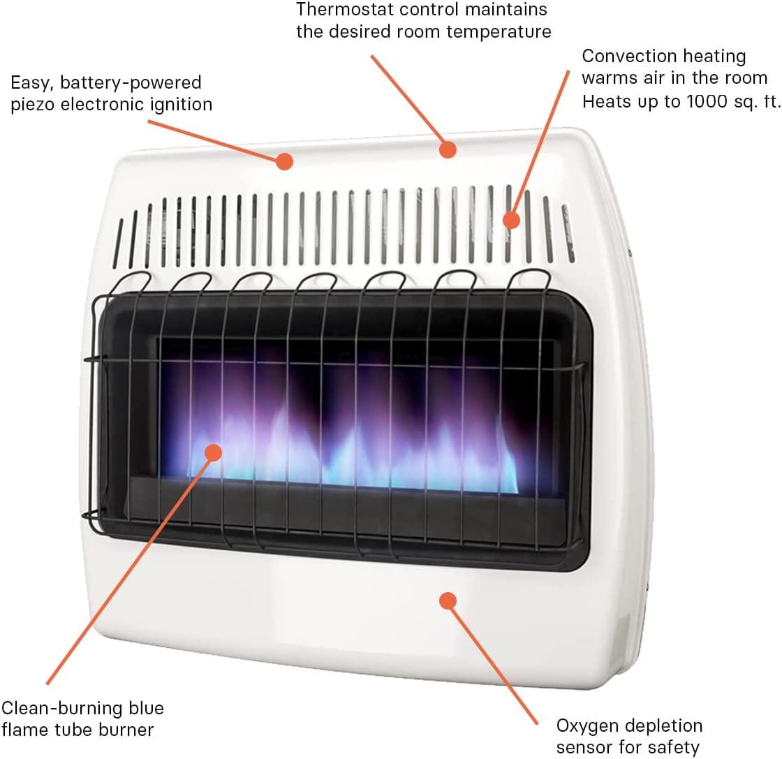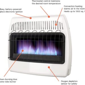 - Features an oxygen depletion sensor and an auto safety shut-off, No electricity required allows for reliable back-up heating incase of an emergency situation