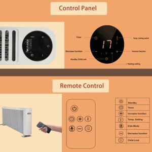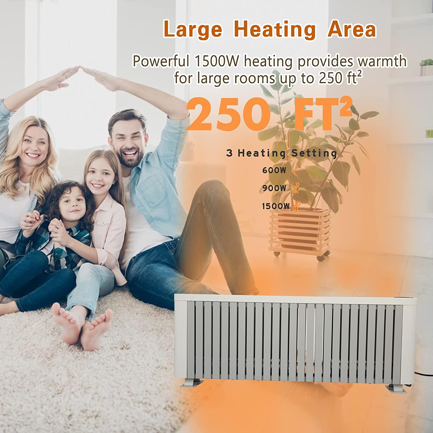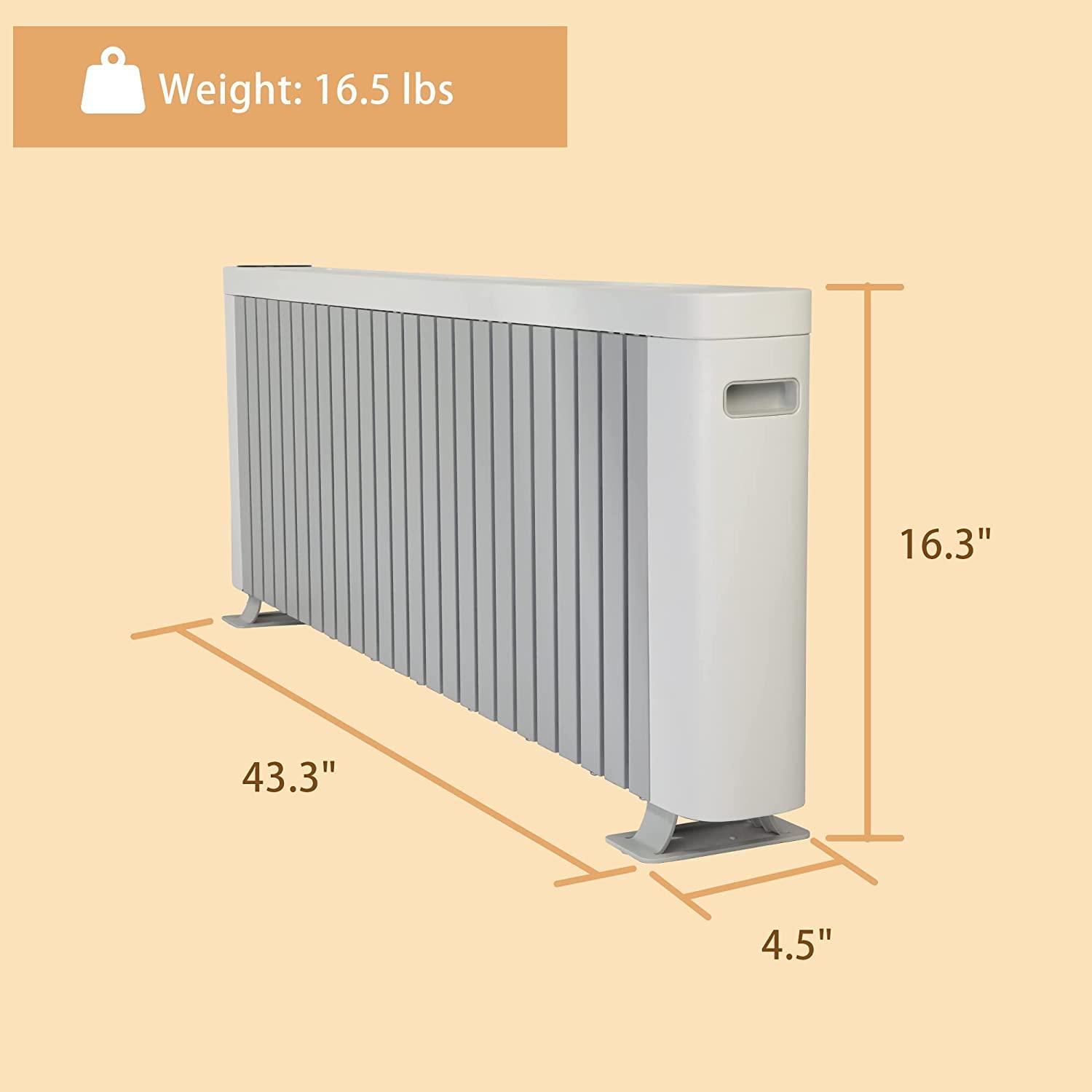 - PERSONALIZED COMFORT: Straightforward LED display and remote control offer a wide range of customization in thermostat (5°C-37°C / 40°F-98°F), timer (0-12h), heating mode (1500W/900W/600W/Kids), child lock and more, area heated (Sq. Ft.):250, Dimension: 43.3″L 4.5″W 16.3″ H, Weight: 16.5lbs