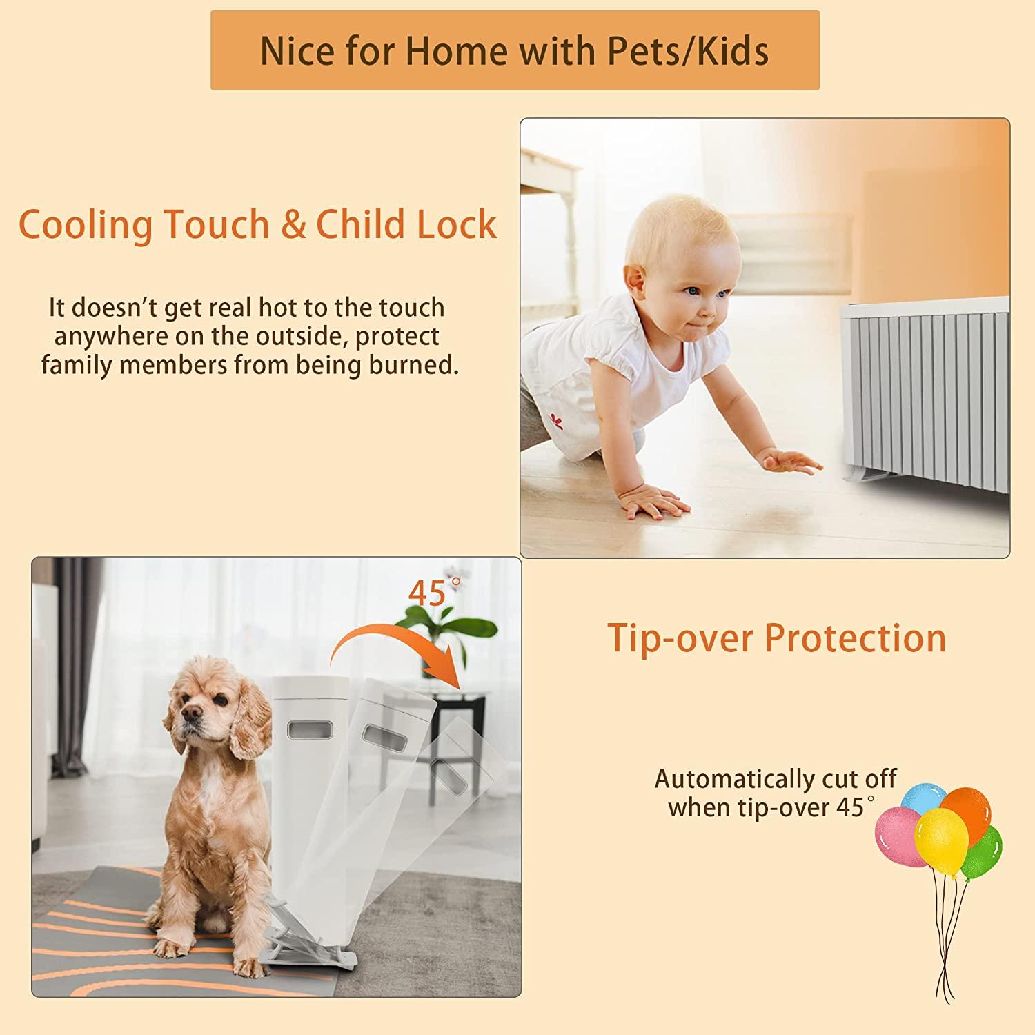 - ENERGY EFFICIENT: Radiant heat, uses less energy than an oscillating kind. During the cold winter, our space heater will keep your house warm and toasty without running up your electric bill. Kids mode is the most economical !
