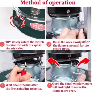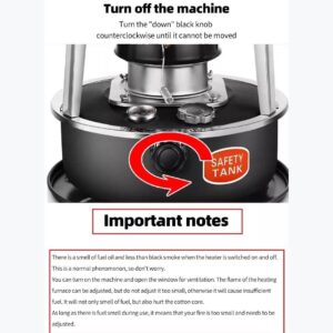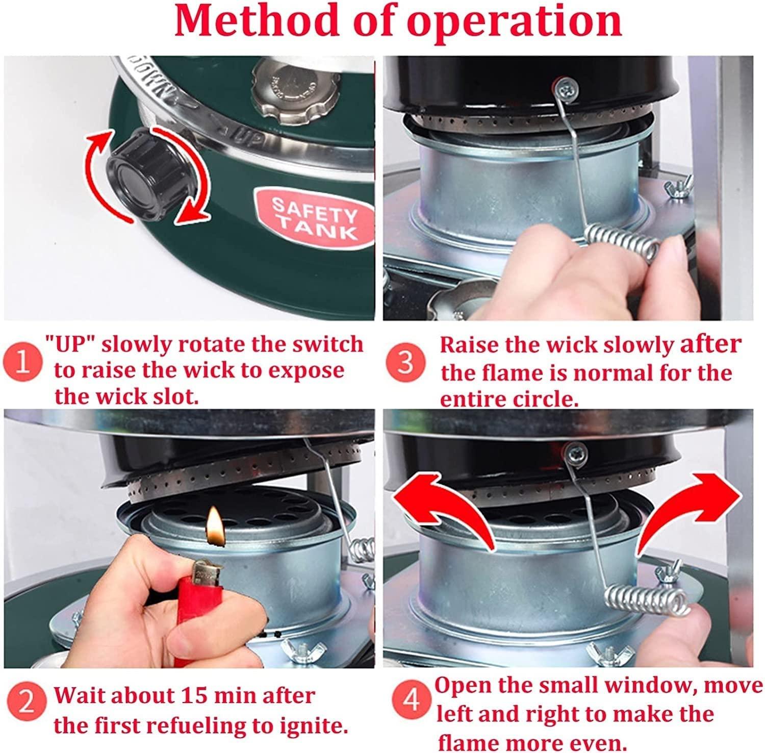 - ?More efficient kerosene heating: The combustion chimney of the indoor portable non-electric kerosene stove is made of special metal, which ensures that the kerosene is fully burned, and the heating is faster and more efficient. Our kerosene heaters have 4 wicks. So you don’t have to worry about running out of wicks. Bring warmth and joy to you, your family and your friends anytime, anywhere.