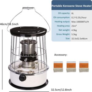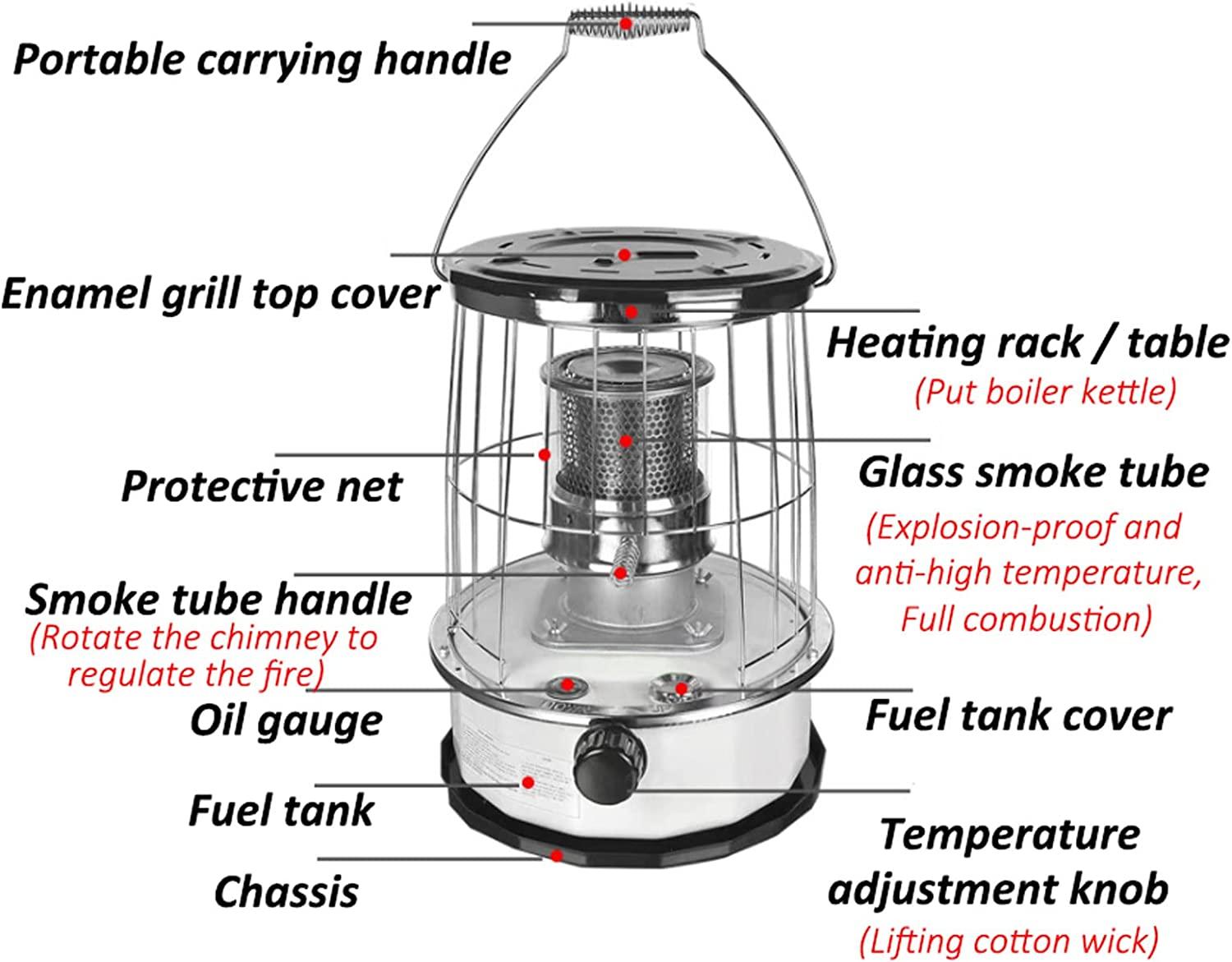 - No electricity needed, efficient heating: excellent emergency heat source. The kerosene heater uses a glass chimney, kerosene can be completely burned, 1 second fast heating, 360 ° large area heating. Oil tank capacity 6L